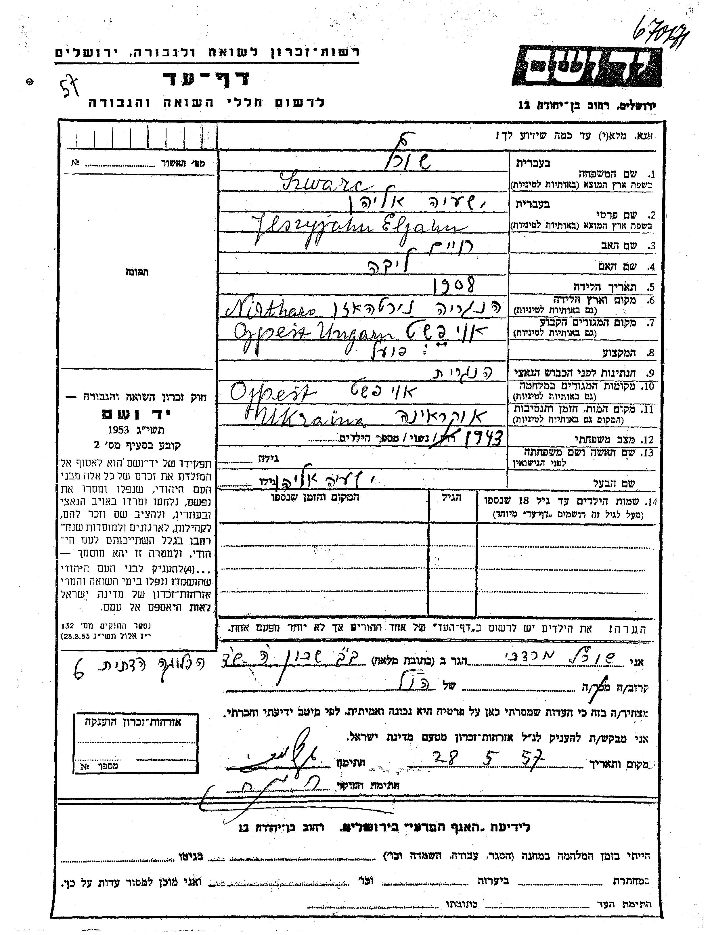 Yeszyjahu Eljahu Yeshiyah Szwarc wurde im Jahr 1908 in Nirthaza, Ungarn geboren. Er war der Sohn von Khaim und Liba. Er war Arbeiter/-in und Verheiratet. Vor dem Zweiten Weltkrieg lebte er in Ojpest, Ungarn. Während des Krieges war er in Ojpest, Ungarn.