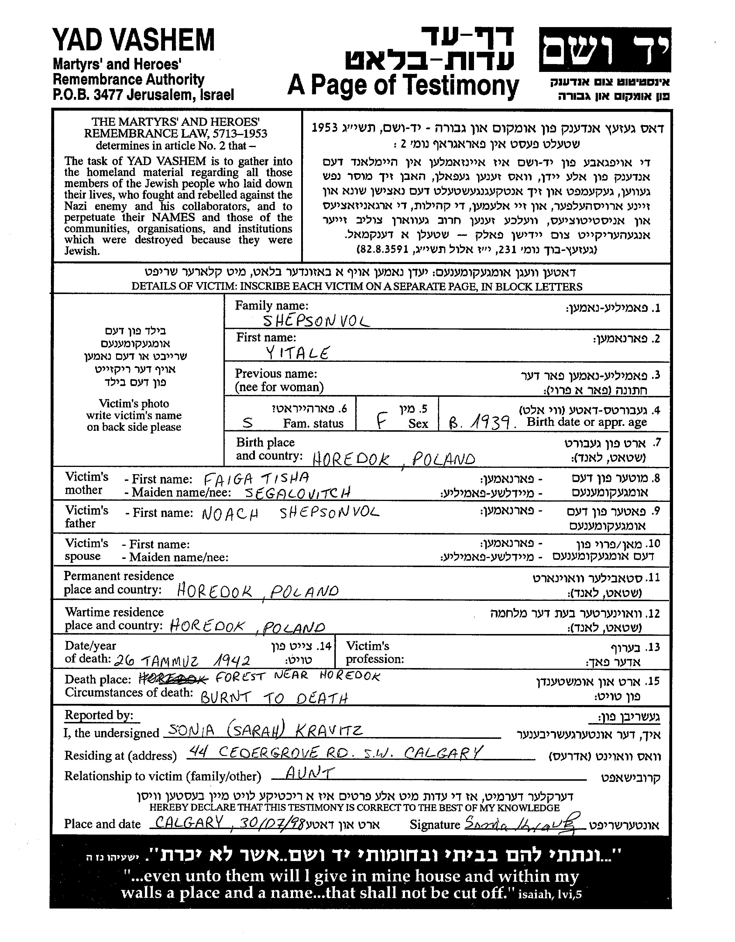 Yitale Shepsonvol wurde im Jahr 1939 in Horedok, Polen geboren. Sie war die Tochter von Noach und Faiga Tisha. Sie war Ledig. Vor dem Zweiten Weltkrieg lebte sie in Horedok, Polen. Während des Krieges war sie in Horedok, Polen.