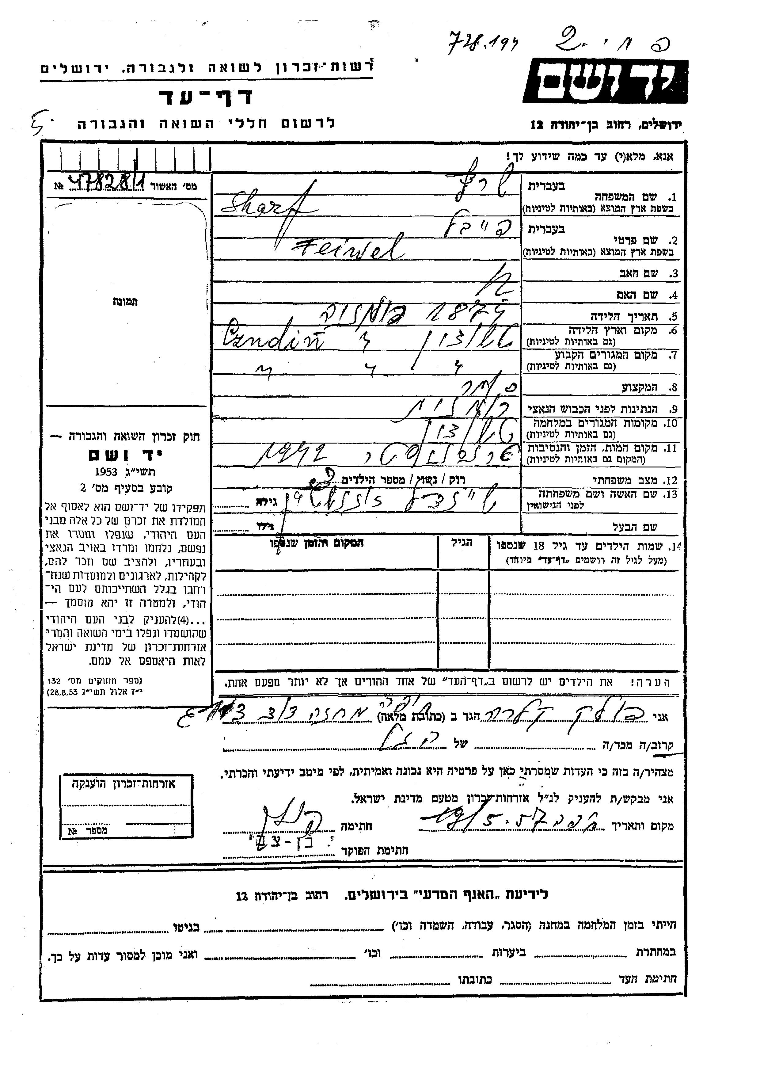 Feiwel Sharf wurde im Jahr 1874 in Czudin, Rumänien geboren. Er war Kaufmann/-frau und mit Sheindl, geb. Zonenshtein Verheiratet. Vor dem Zweiten Weltkrieg lebte er in Czudin, Rumänien. Während des Krieges war er in Czudin, Rumänien.