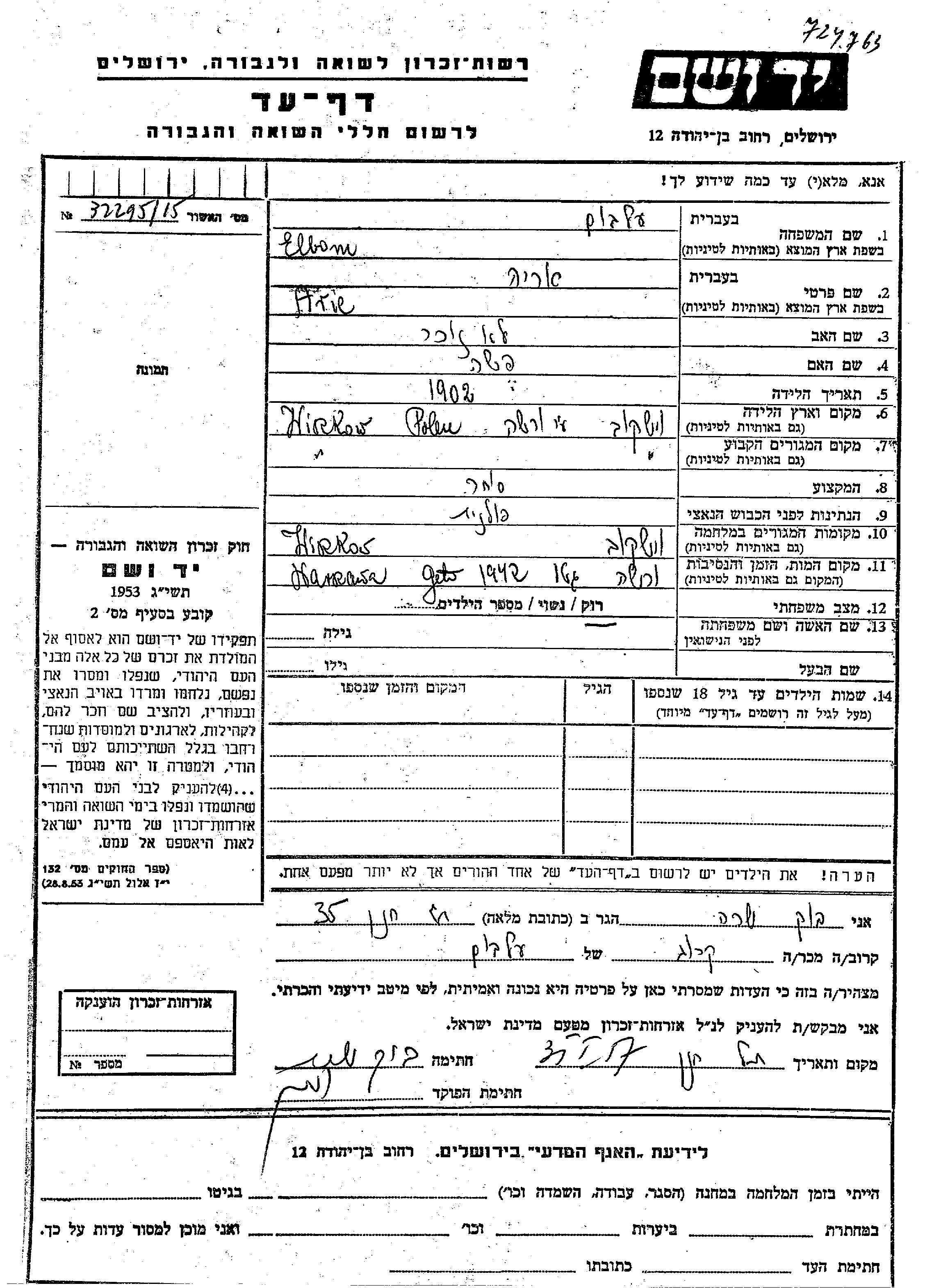 Arie Elbom wurde im Jahr 1902 in Wyszkow, Polen geboren. Er war der Sohn von Pasha. Er war Kaufmann/-frau und Ledig. Vor dem Zweiten Weltkrieg lebte er in Wyszkow, Polen. Während des Krieges war er in Wyszkow, Polen.