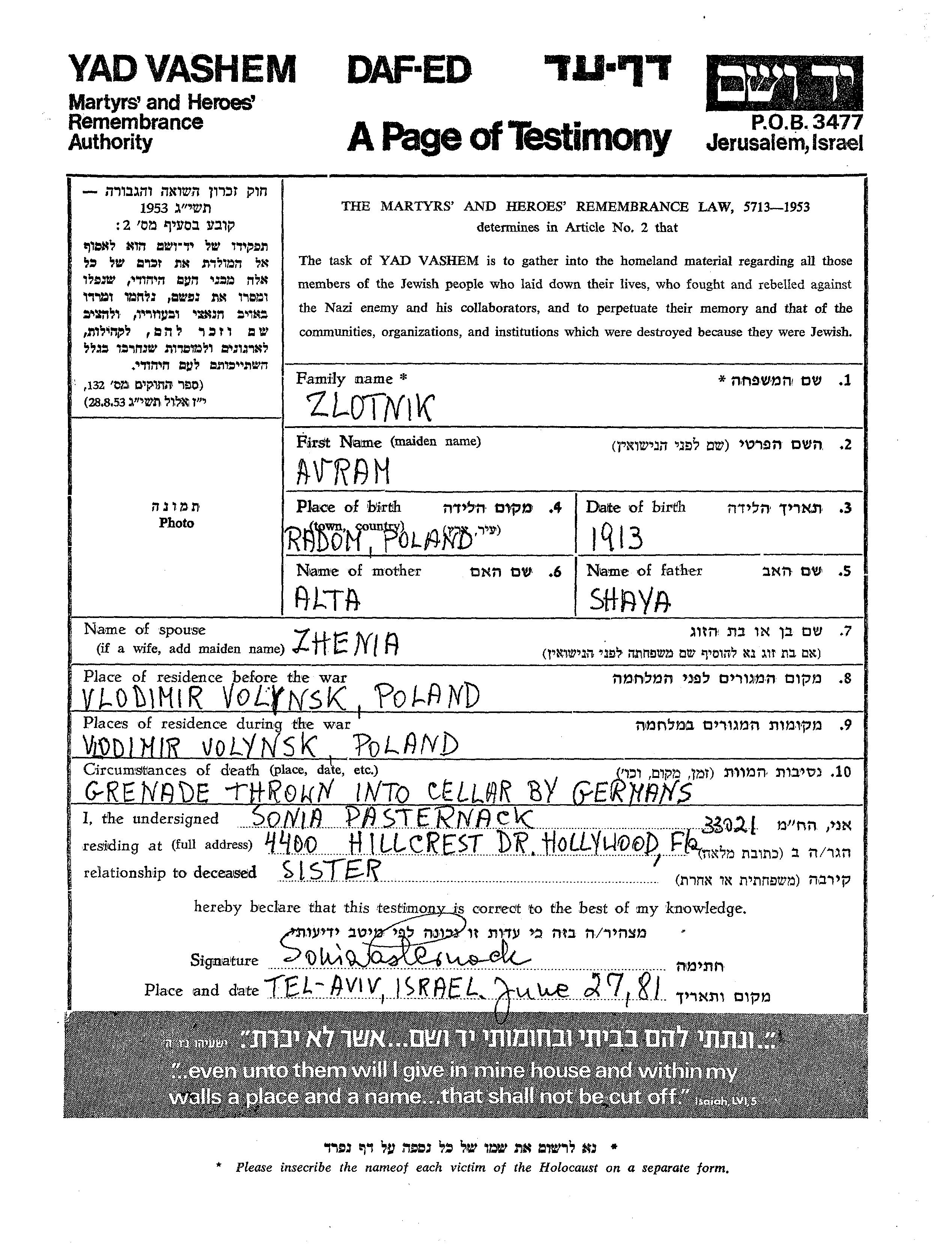 Avram Zlotnik wurde im Jahr 1913 in Radom, Polen geboren. Er war der Sohn von Shaya und Alta. Vor dem Zweiten Weltkrieg lebte er in Vlodimir, Polen. Während des Krieges war er in Vlodimir, Polen.