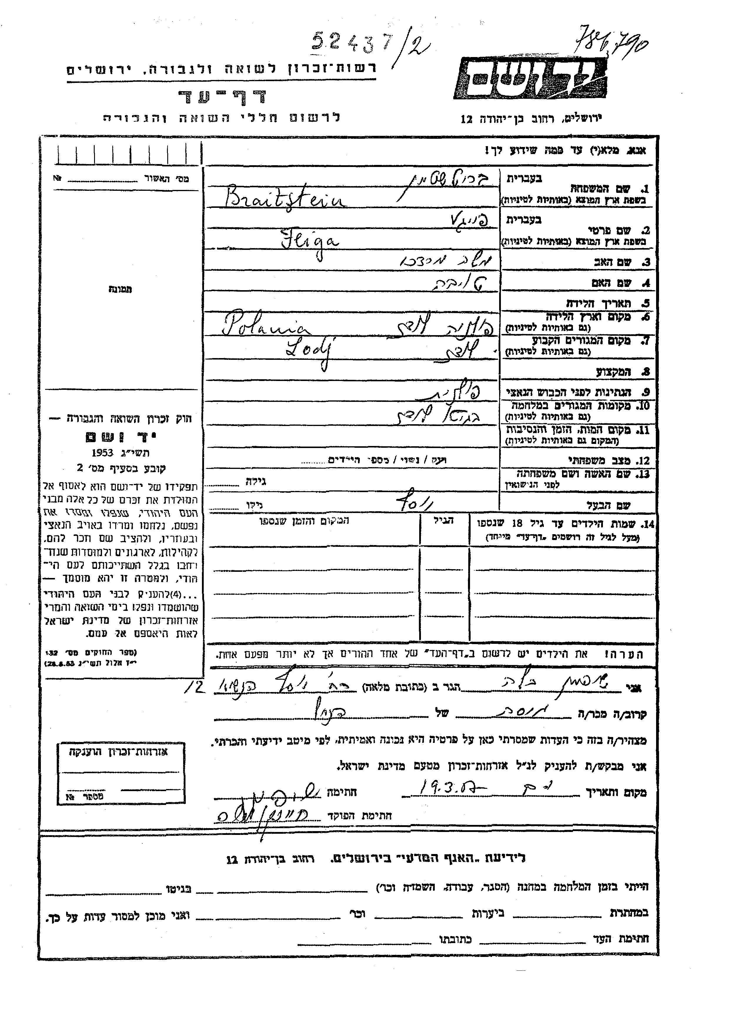 Feige Braitstein Britshtein wurde in Lodz, Polen geboren. Sie war die Tochter von Moshe Mordekhai und Toibe. Sie war mit Yosef Verheiratet. Vor dem Zweiten Weltkrieg lebte sie in Lodz, Polen. Während des Krieges war sie in Lodz, Polen.