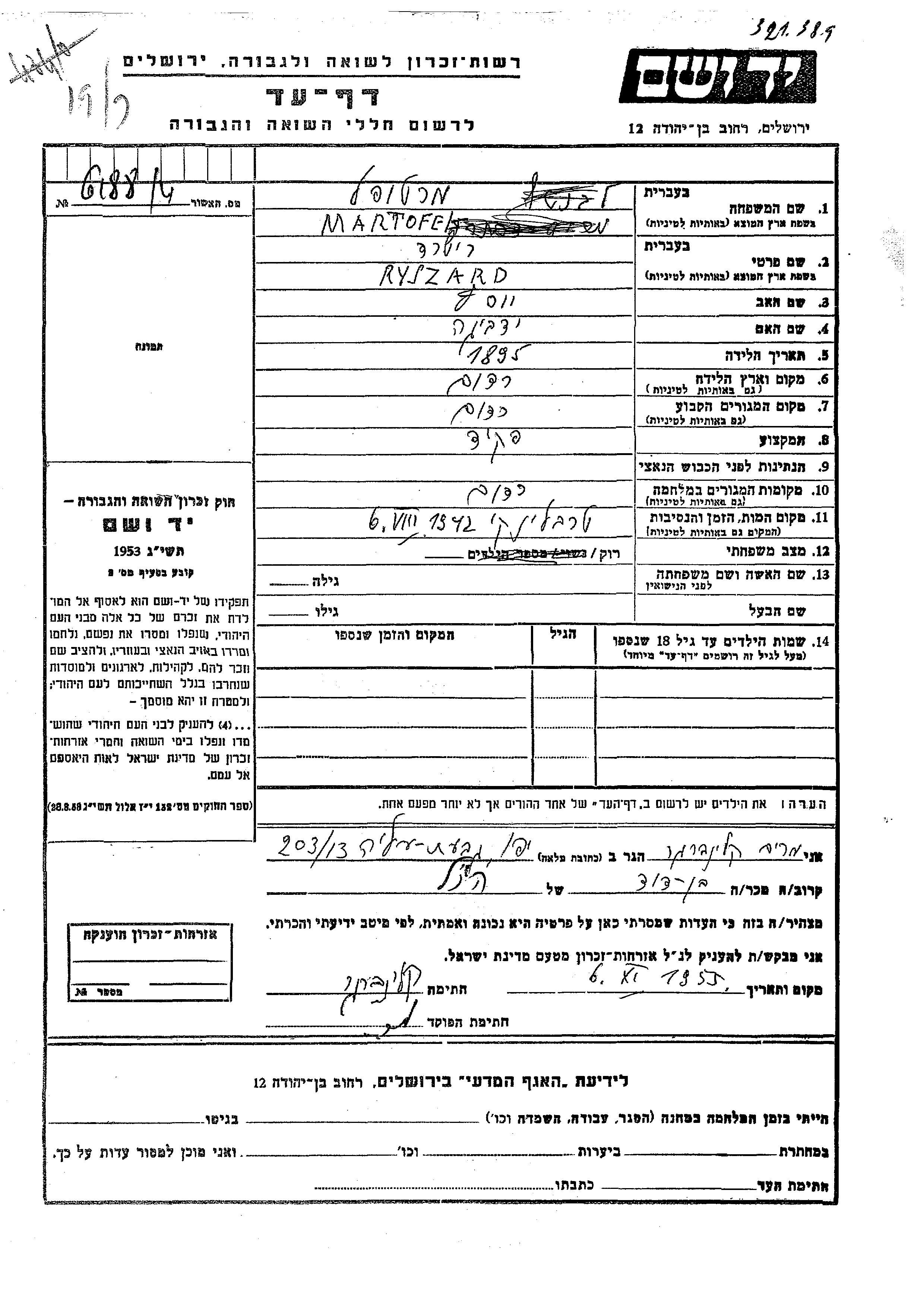 Ryszard Martofel wurde im Jahr 1895 in Radom, Polen geboren. Er war der Sohn von Yosef und Yadviga. Er war Angestellte/-r und Ledig. Vor dem Zweiten Weltkrieg lebte er in Radom, Polen. Während des Krieges war er in Radom, Polen.