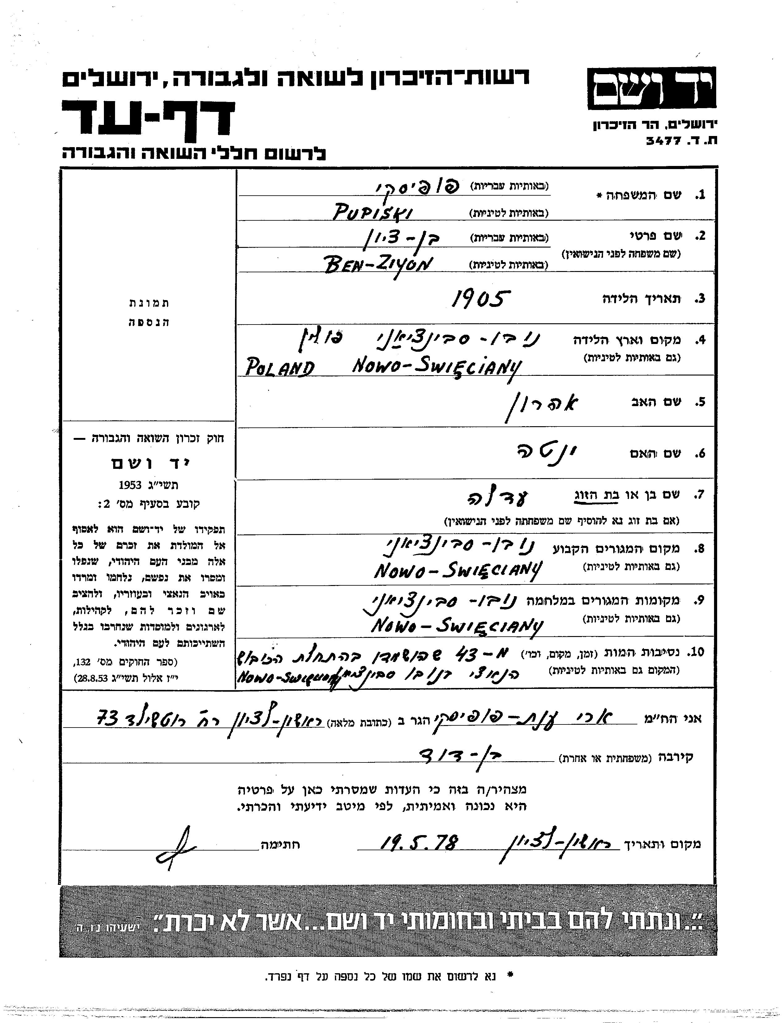 Ben Ziyon Pupiski wurde im Jahr 1905 in Nowo Swieciany, Polen geboren. Er war der Sohn von Aharon und Yenta. Er war mit Adela Verheiratet. Vor dem Zweiten Weltkrieg lebte er in Nowo Swieciany, Polen. Während des Krieges war er in Nowo Swieciany, Polen.