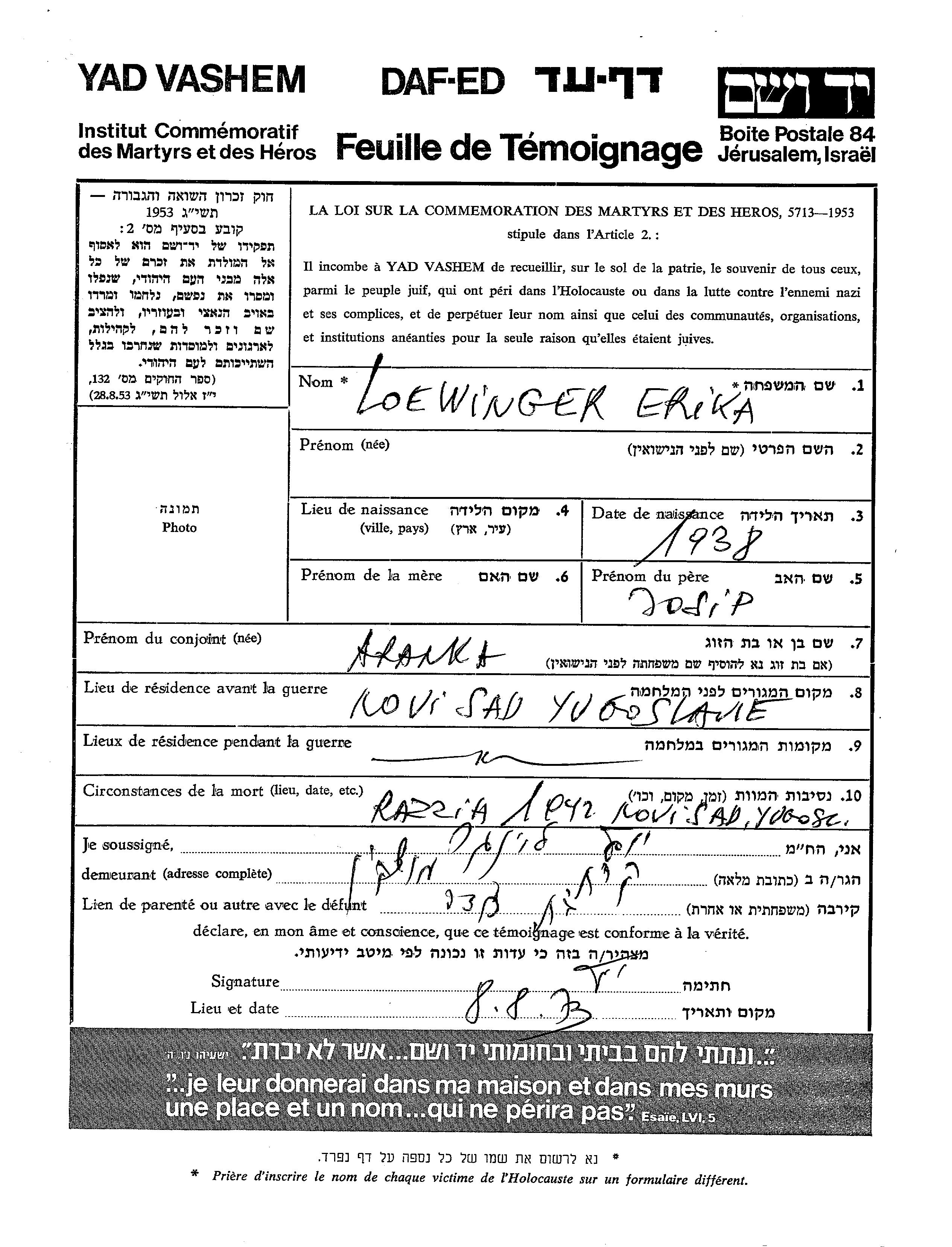 Erika Löwinger wurde im Jahr 1938 geboren. Sie war die Tochter von Josip. Vor dem Zweiten Weltkrieg lebte sie in Novi Sad, Jugoslawien. Während des Krieges war sie in Novi Sad, Jugoslawien.
