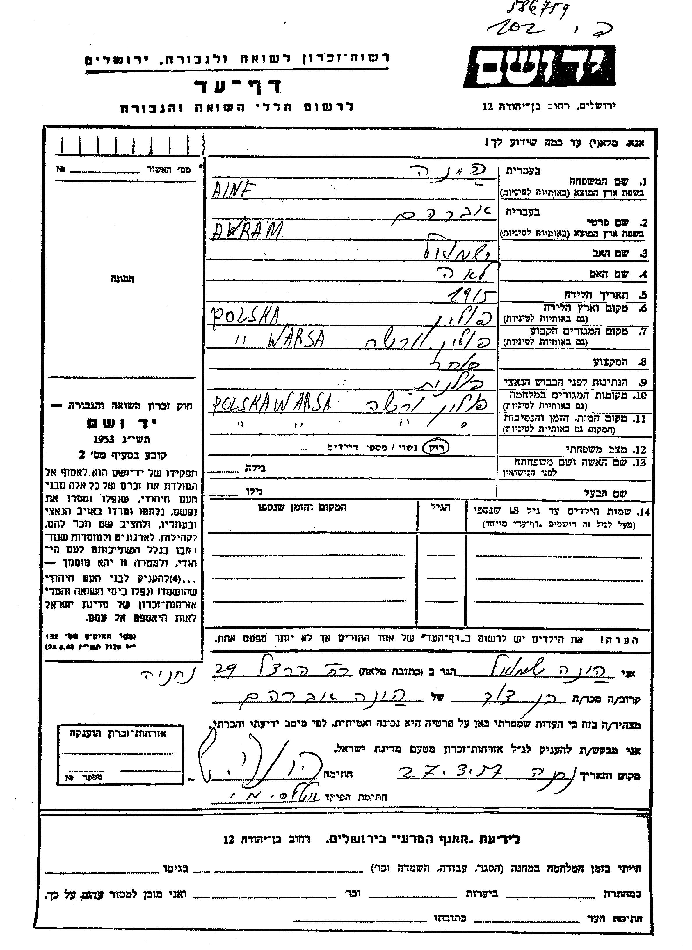 Avram Aine wurde im Jahr 1915 in Warszawa, Polen geboren. Er war der Sohn von Shmuel und Lea. Er war Kaufmann/-frau und Ledig. Vor dem Zweiten Weltkrieg lebte er in Warszawa, Polen. Während des Krieges war er in Warszawa, Polen.