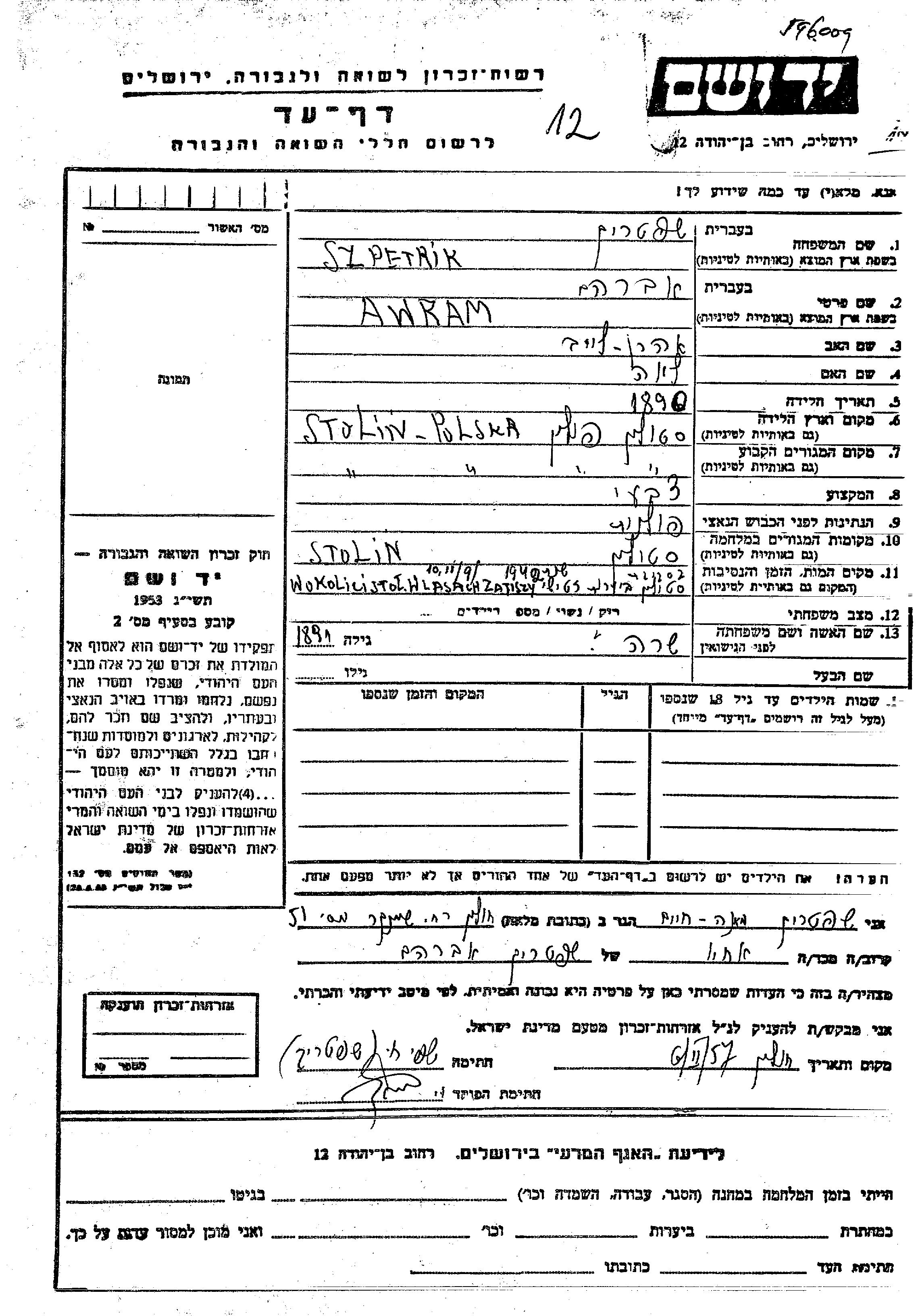 Awram Szpetrik wurde im Jahr 1890 in Stolin, Polen geboren. Er war der Sohn von Aharon Leib und Lea. Er war Anstreicher/-in und mit Sara Verheiratet. Vor dem Zweiten Weltkrieg lebte er in Stolin, Polen. Während des Krieges war er in Stolin, Polen.
