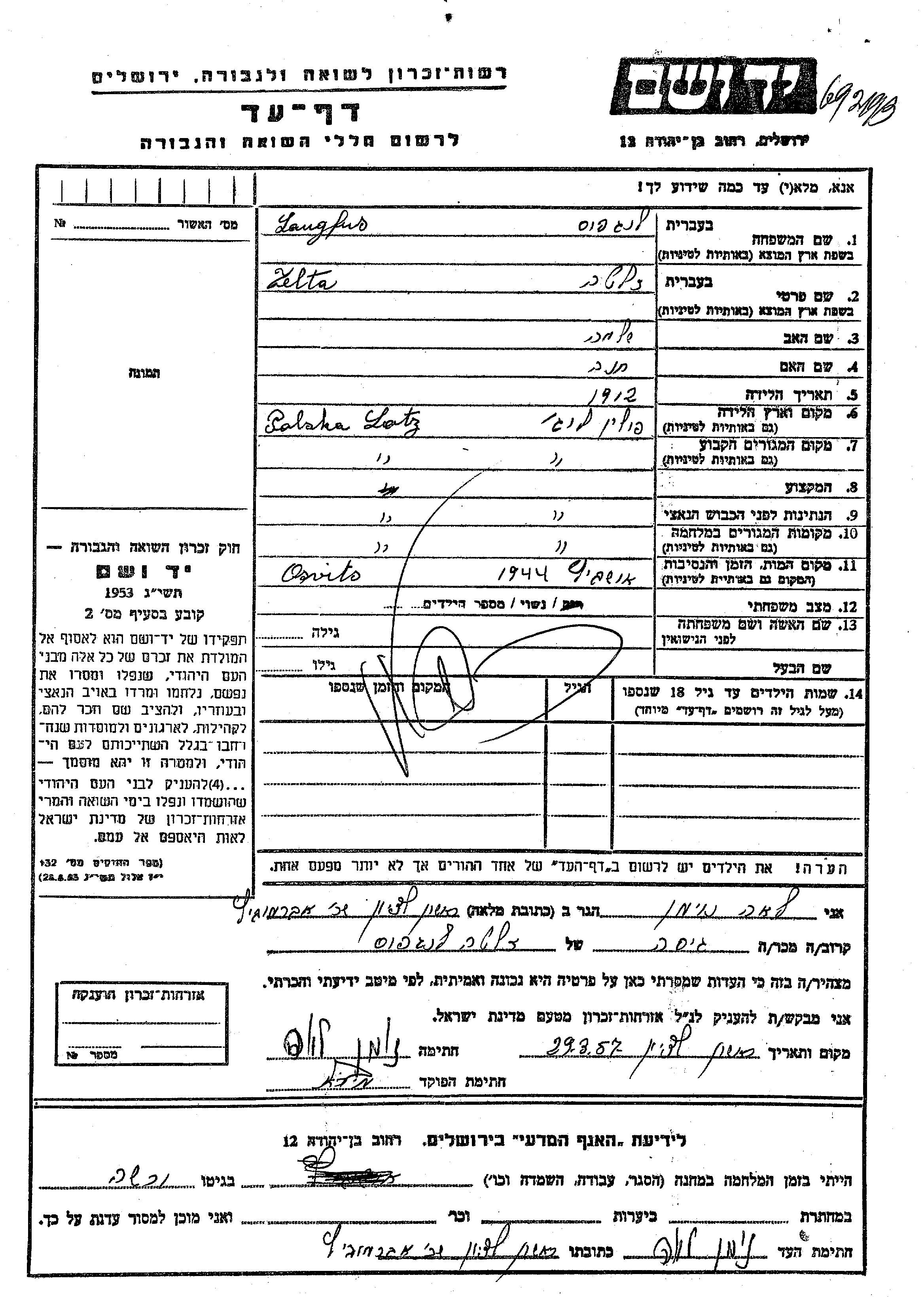 Zelta Langfus wurde im Jahr 1912 in Lodz, Polen geboren. Sie war die Tochter von Shlomo und Khana. Sie war Verheiratet. Vor dem Zweiten Weltkrieg lebte sie in Lodz, Polen. Während des Krieges war sie in Lodz, Polen.