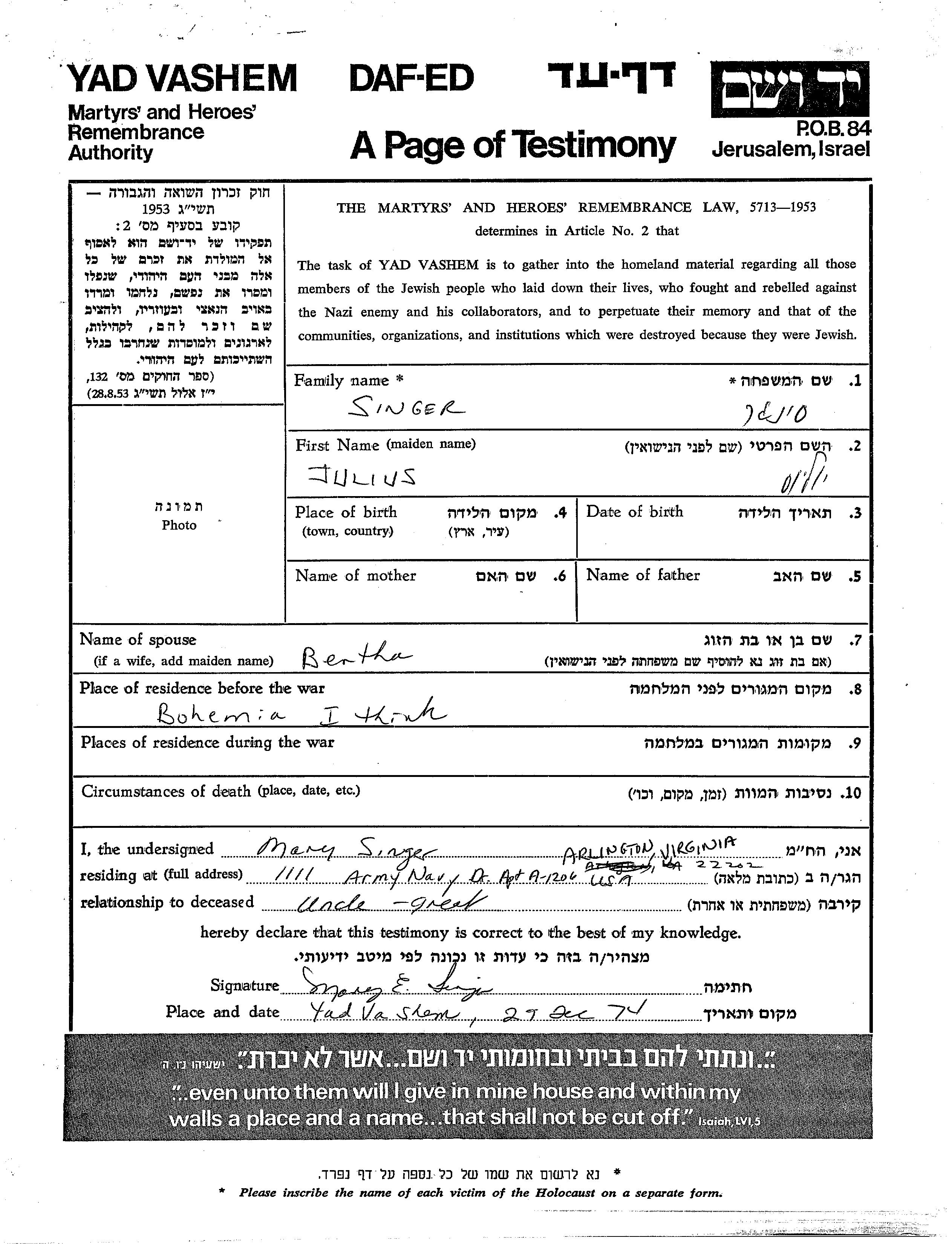 Julius Singer. Er war mit Bertha Verheiratet. Vor dem Zweiten Weltkrieg lebte er in Bohemia, Tschechoslowakei.