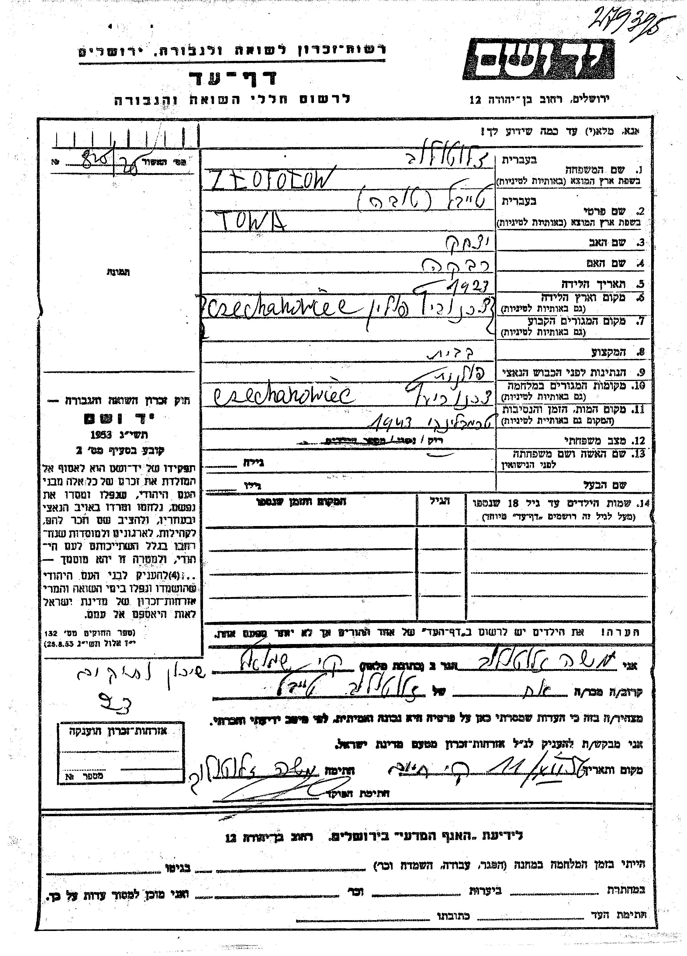 Towa Teibel Zlotolow wurde im Jahr 1923 in Czechanowice, Polen geboren. Sie war die Tochter von Yitzkhak und Rivka. Sie war Hausfrau und Ledig. Vor dem Zweiten Weltkrieg lebte sie in Czechanowice, Polen. Während des Krieges war sie in Czechanowice, Polen.