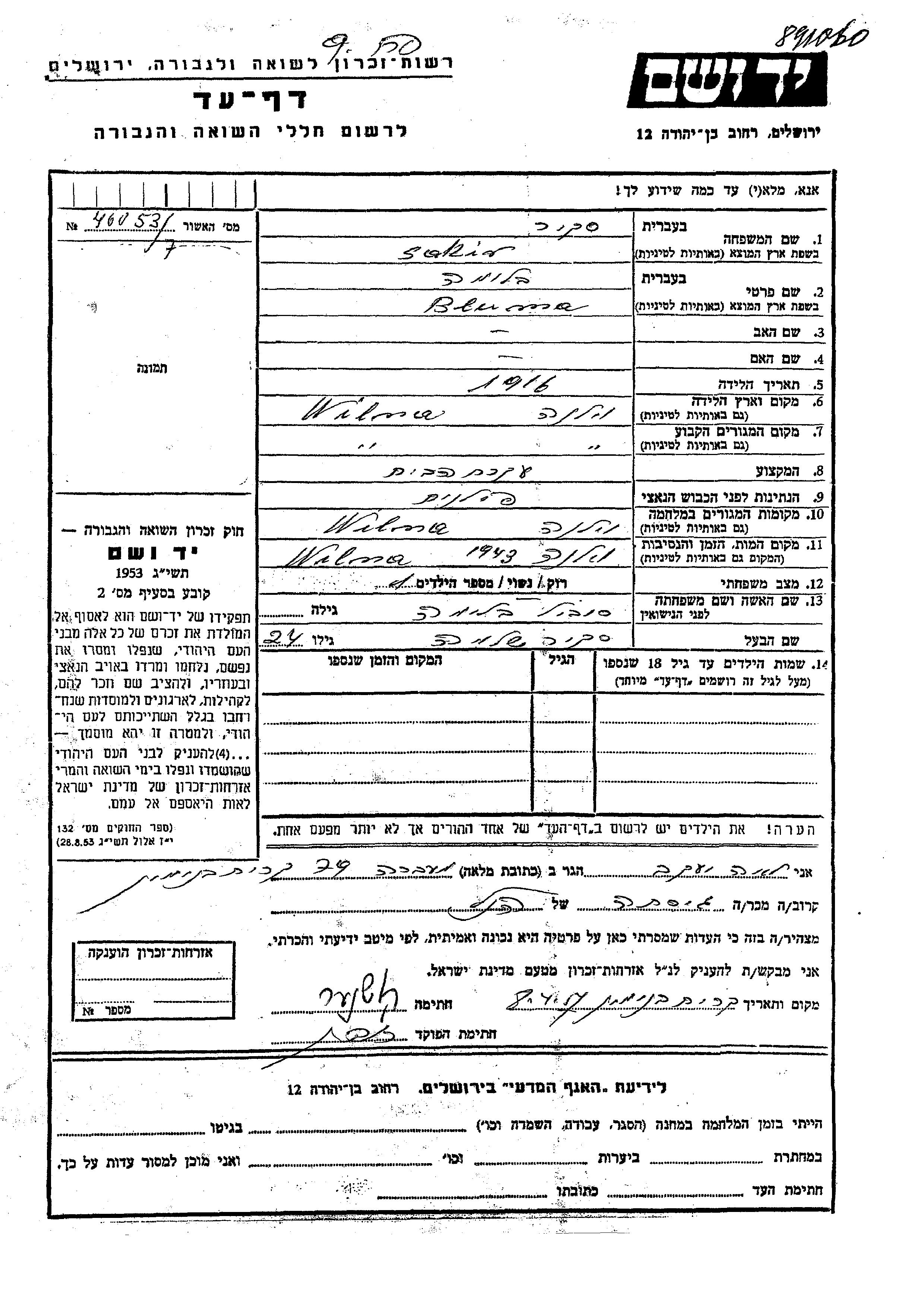 Bluma Sakir, geb. Sobel wurde im Jahr 1916 in Wilna, Polen geboren. Sie war Hausfrau und mit Shlomo Verheiratet. Vor dem Zweiten Weltkrieg lebte sie in Wilna, Polen. Während des Krieges war sie in Wilna, Polen.