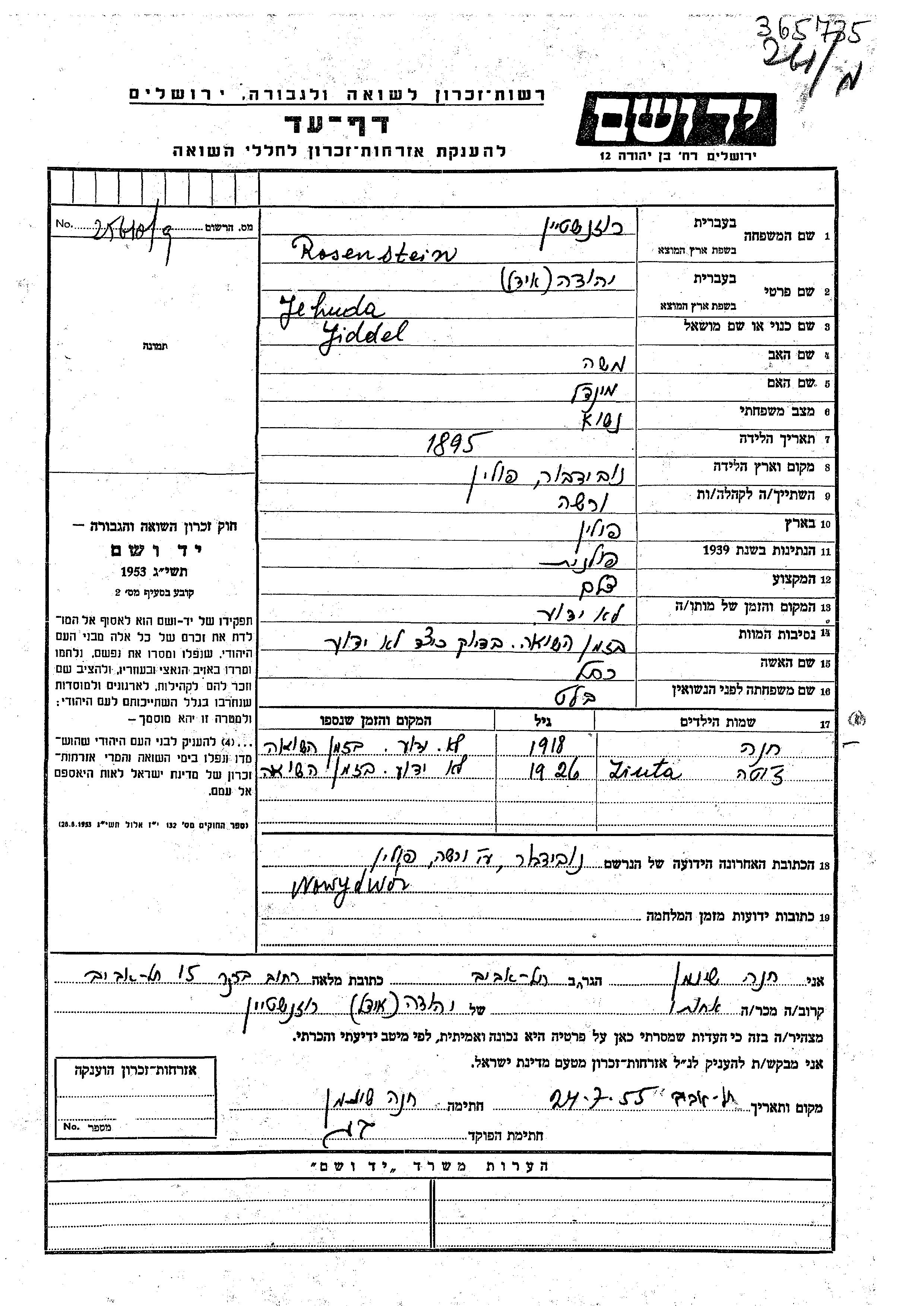 Yiddel Rosenstein wurde im Jahr 1895 in Nowy Dwor Mazowiecki, Polen geboren. Er war der Sohn von Moshe und Mindl. Er war Fotograf/-in und mit Rakhel, geb. Blat Verheiratet. Vor dem Zweiten Weltkrieg lebte er in Warszawa, Polen.