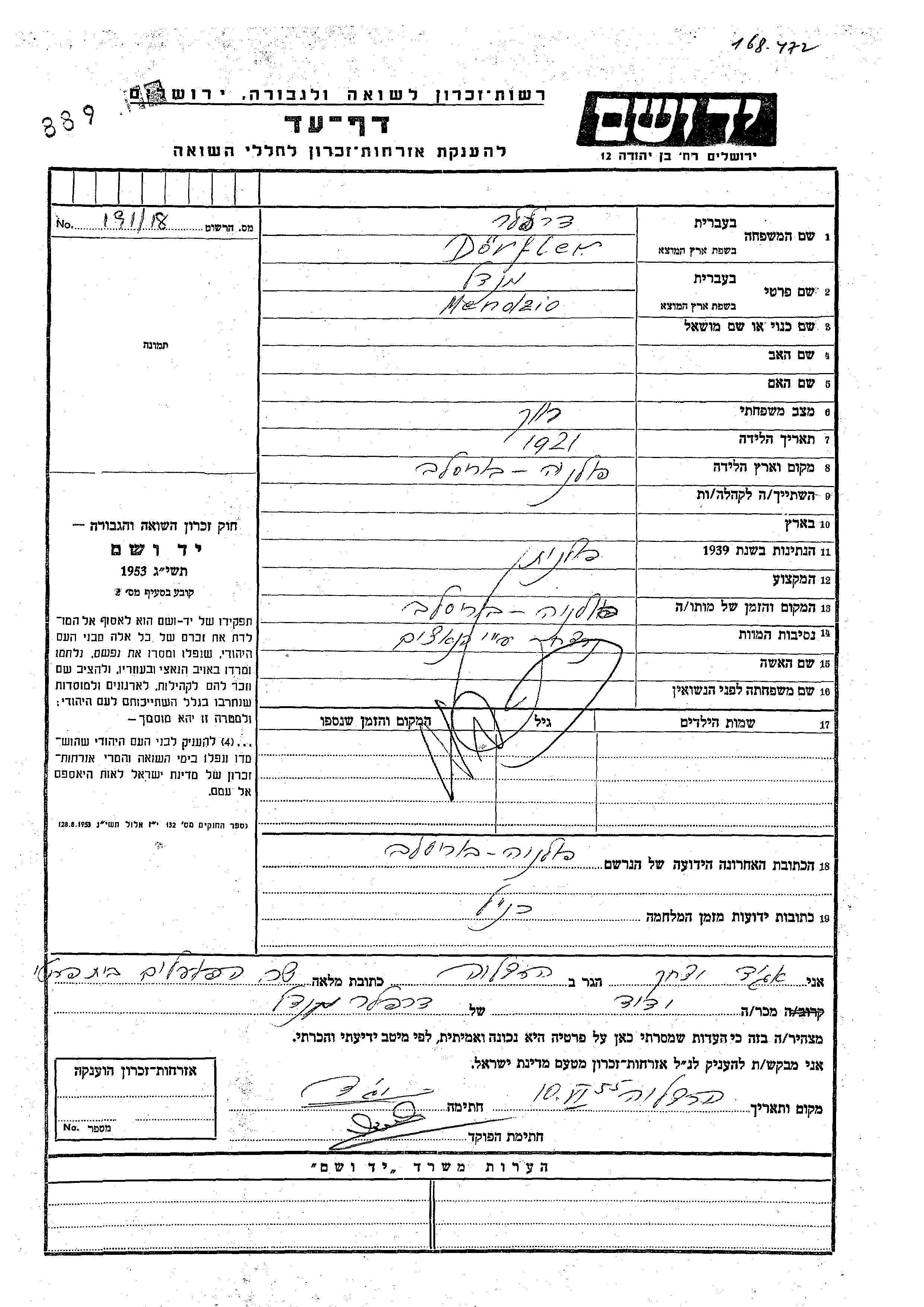 Mendzio Dorfler wurde im Jahr 1921 in Boryslaw, Polen geboren. Er war Ledig. Während des Krieges war er in Boryslaw, Polen.