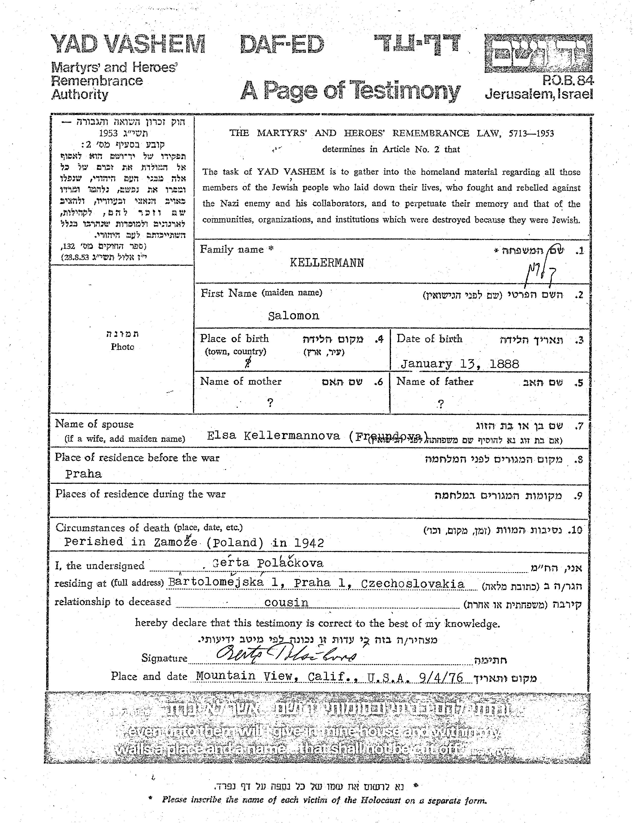 Salomon Kellermann wurde im Jahr 1888 geboren. Er war mit Elsa, geb. Freundova Verheiratet. Vor dem Zweiten Weltkrieg lebte er in Praha, Tschechoslowakei.