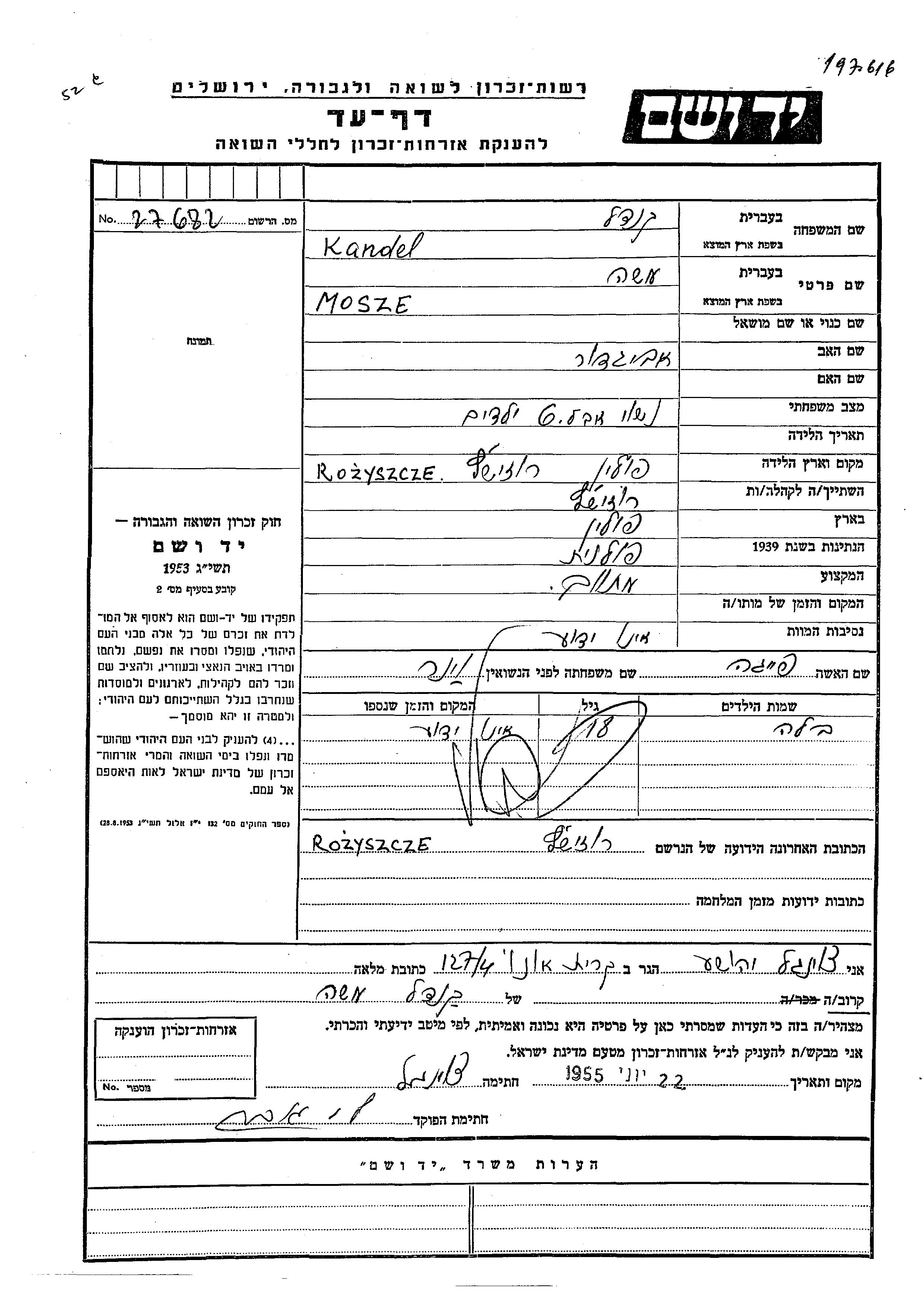 Mosze Kandel wurde in Rozyszcze, Polen geboren. Er war der Sohn von Avigdor. Er war Makler und mit Feiga, geb. Viner Verheiratet. Vor dem Zweiten Weltkrieg lebte er in Rozyszcze, Polen.