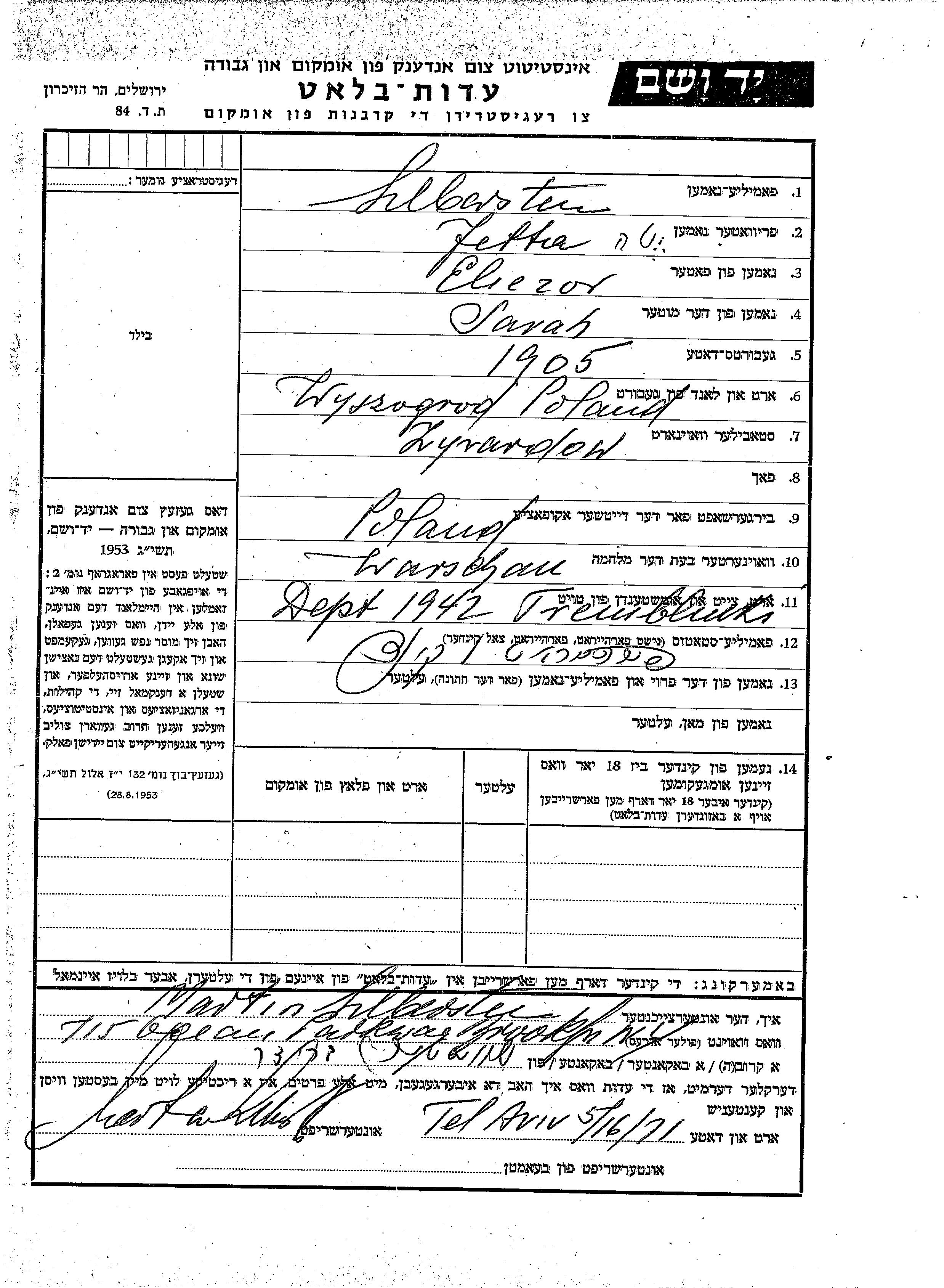 Jetta Yeta Silberstein wurde im Jahr 1905 in Wyszogrod, Polen geboren. Sie war die Tochter von Eliezor und Sarah. Sie war Verheiratet. Vor dem Zweiten Weltkrieg lebte sie in Zyrardow, Polen. Während des Krieges war sie in Warsaw, Polen.