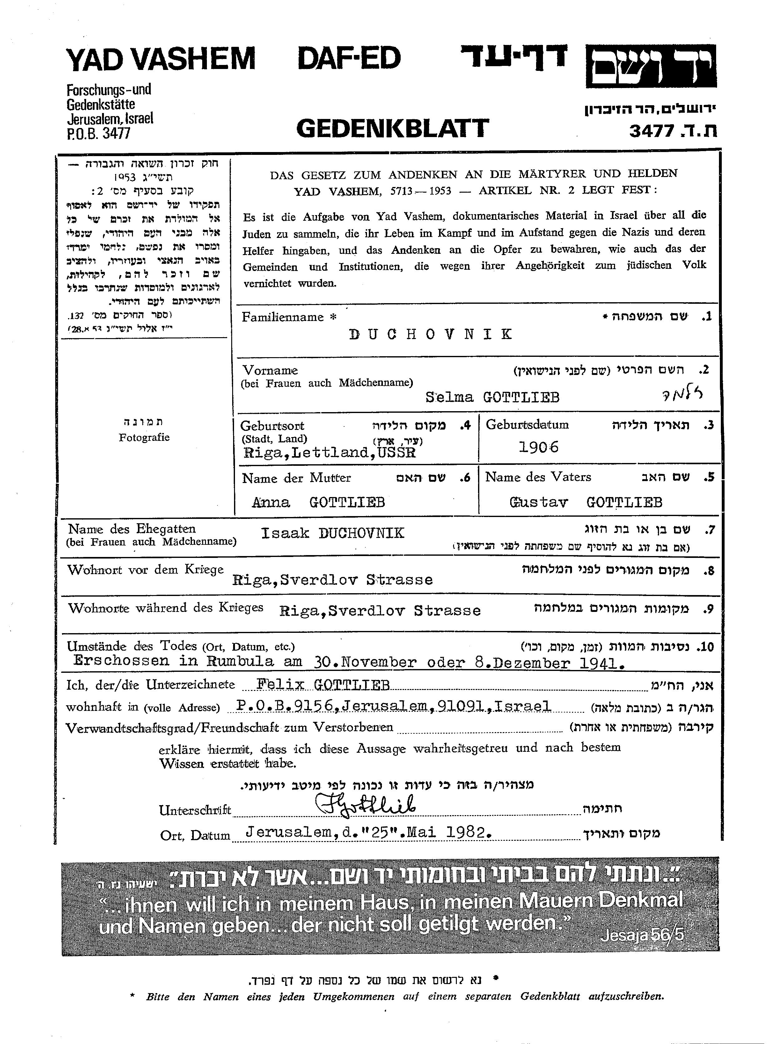 Selma Duchovnik, geb. Gottlieb wurde im Jahr 1906 in Riga, Lettland geboren. Sie war die Tochter von Gustav und Anna. Sie war mit Isaak Verheiratet. Vor dem Zweiten Weltkrieg lebte sie in Riga, Lettland. Während des Krieges war sie in Riga, Lettland.