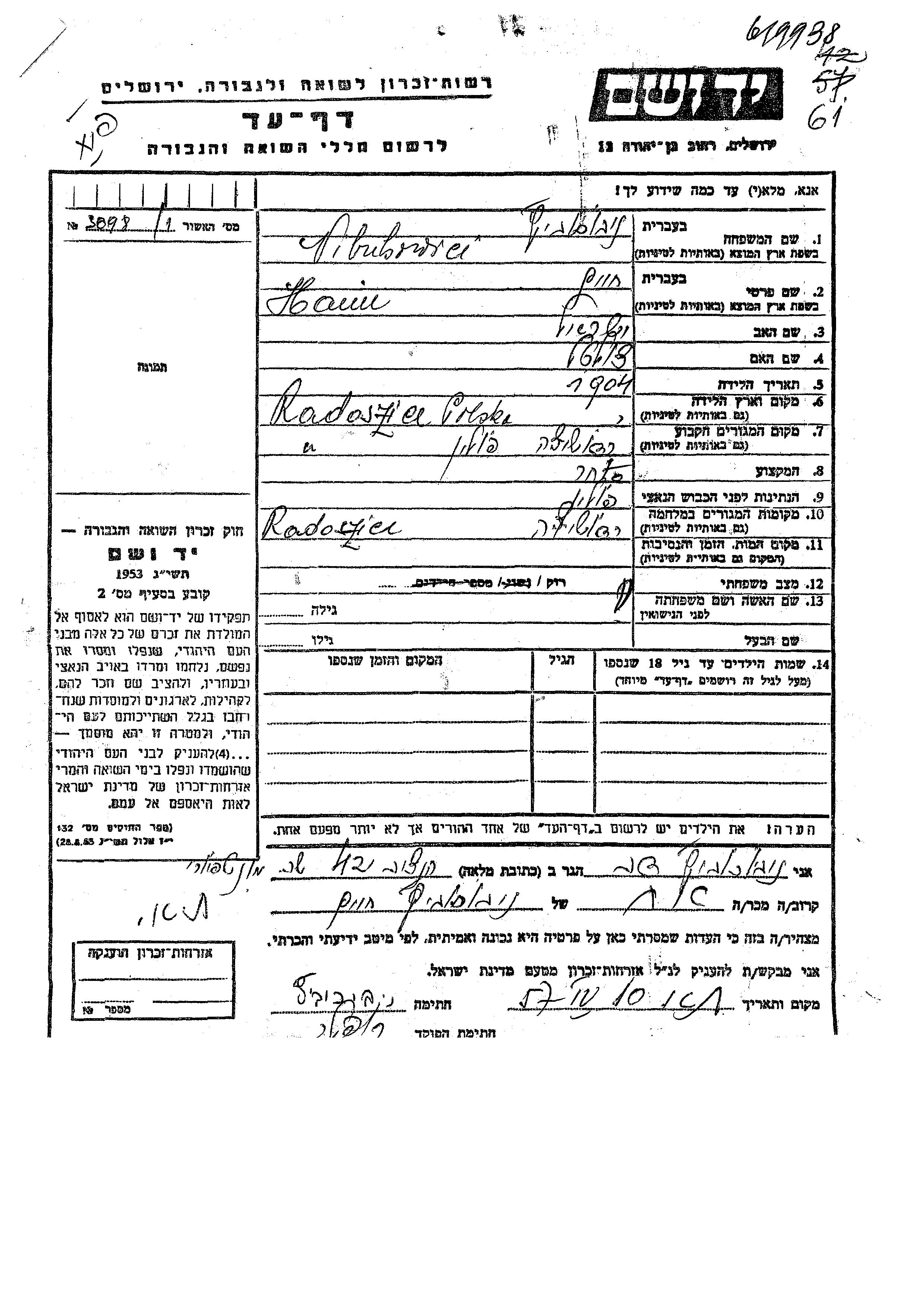 Haim Nibuhowici wurde im Jahr 1904 in Radoshitz, Polen geboren. Er war der Sohn von Yisrael und Zlata. Er war Kaufmann/-frau und Ledig. Vor dem Zweiten Weltkrieg lebte er in Radoshitz, Polen. Während des Krieges war er in Radoshitz, Polen.