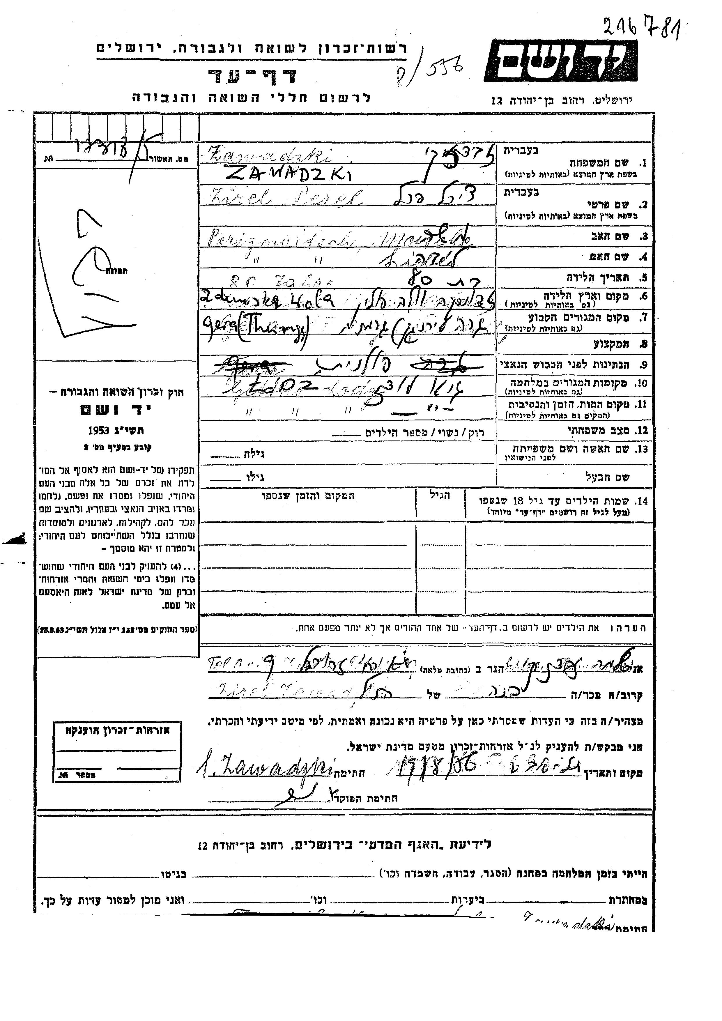 Tzirel Perel Zawadzki wurde in Zdunska Wola, Polen geboren. Sie war die Tochter von Moshe und Liba. Sie war Verheiratet. Vor dem Zweiten Weltkrieg lebte sie in Gera, Deutsches Reich. Während des Krieges war sie in Lodz, Polen.