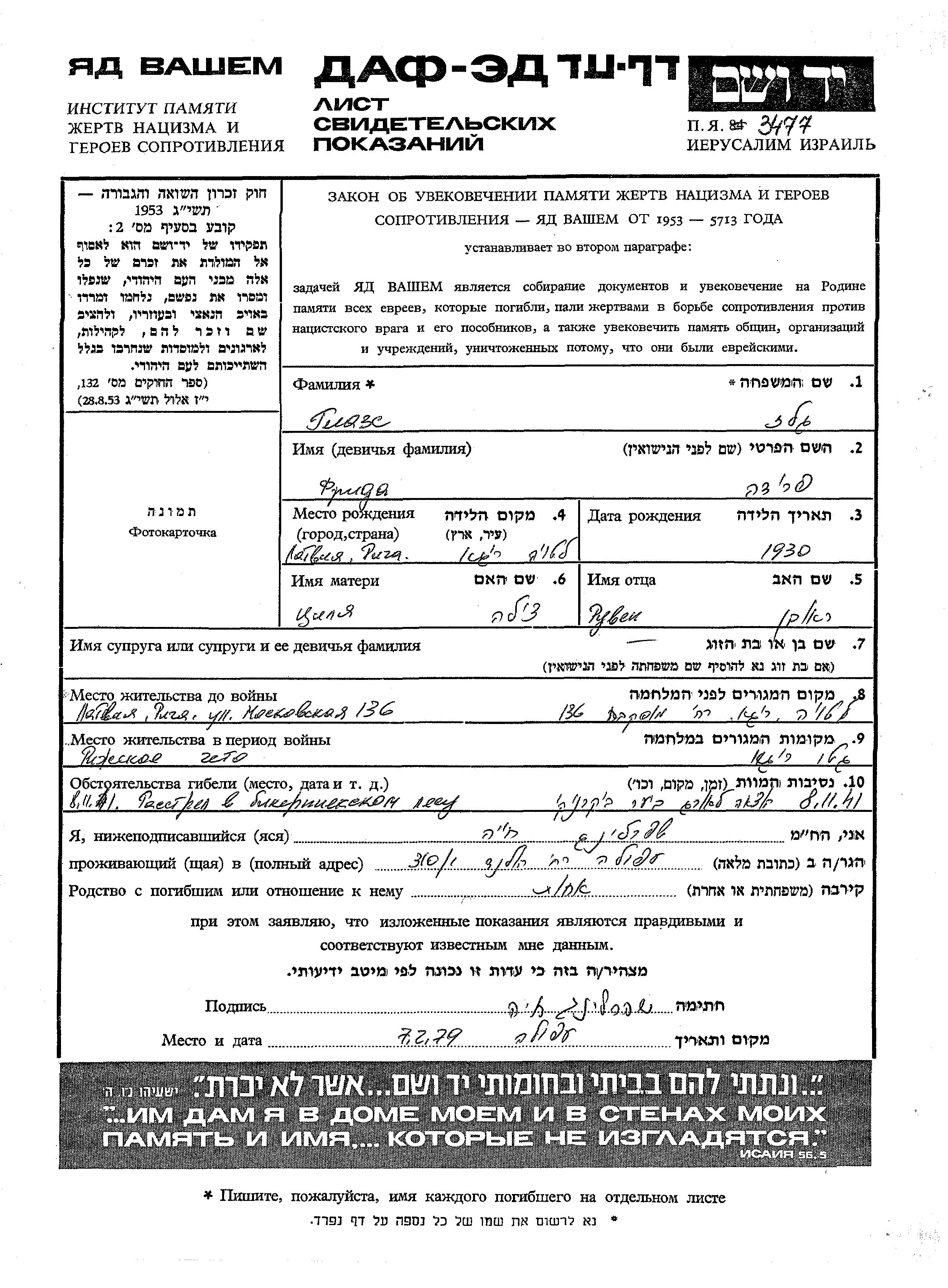 Frida Glaze wurde im Jahr 1930 in Riga, Lettland geboren. Sie war die Tochter von Ruven und Tzila. Vor dem Zweiten Weltkrieg lebte sie in Riga, Lettland. Während des Krieges war sie in Riga, Lettland.