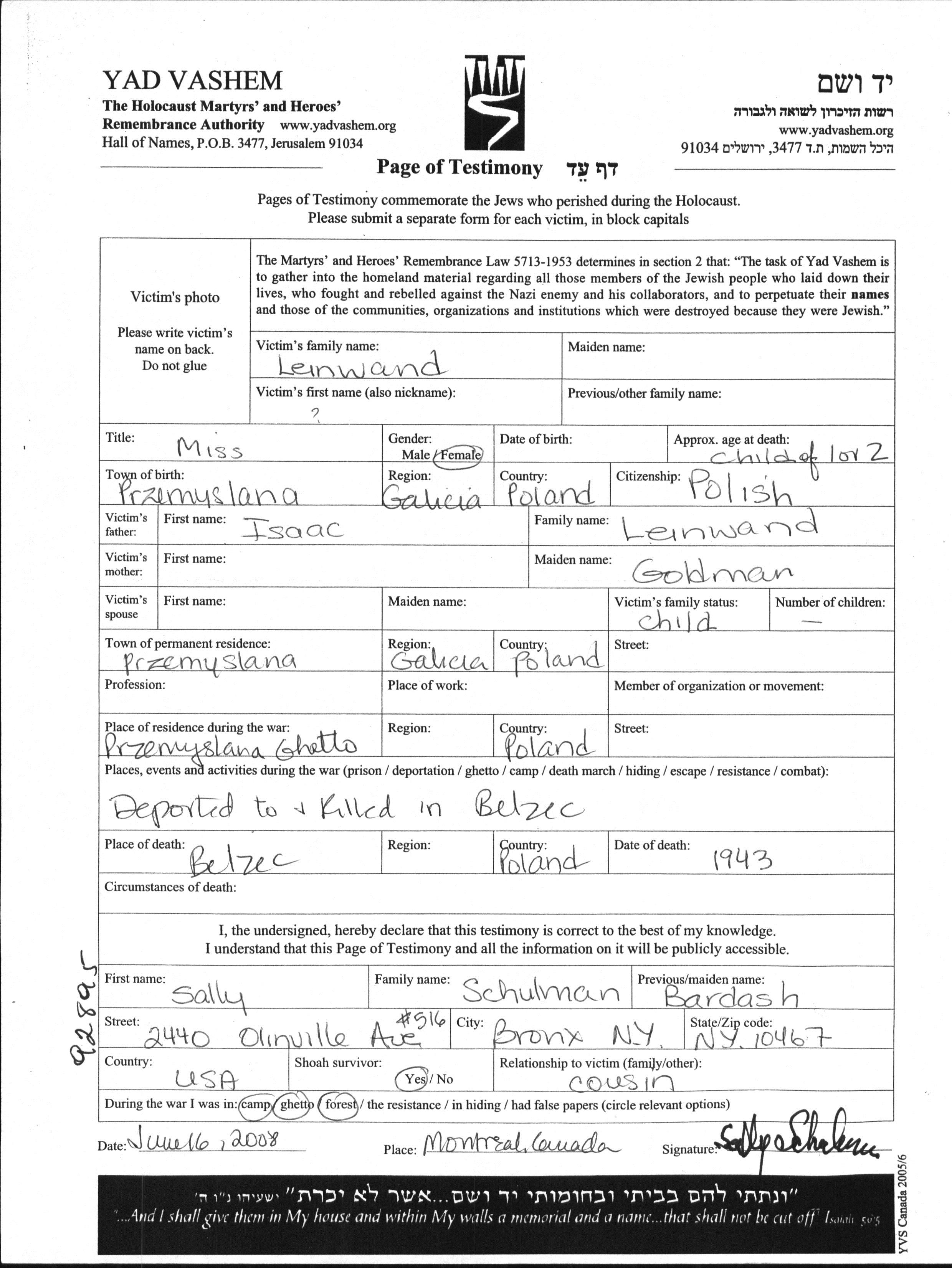 Vorname unbekannt Leinwand wurde in Przemyslany, Polen geboren. Sie war die Tochter von Isaac. Sie war Kind. Vor dem Zweiten Weltkrieg lebte sie in Przemyslany, Polen. Während des Krieges war sie in Przemyslany, Polen.