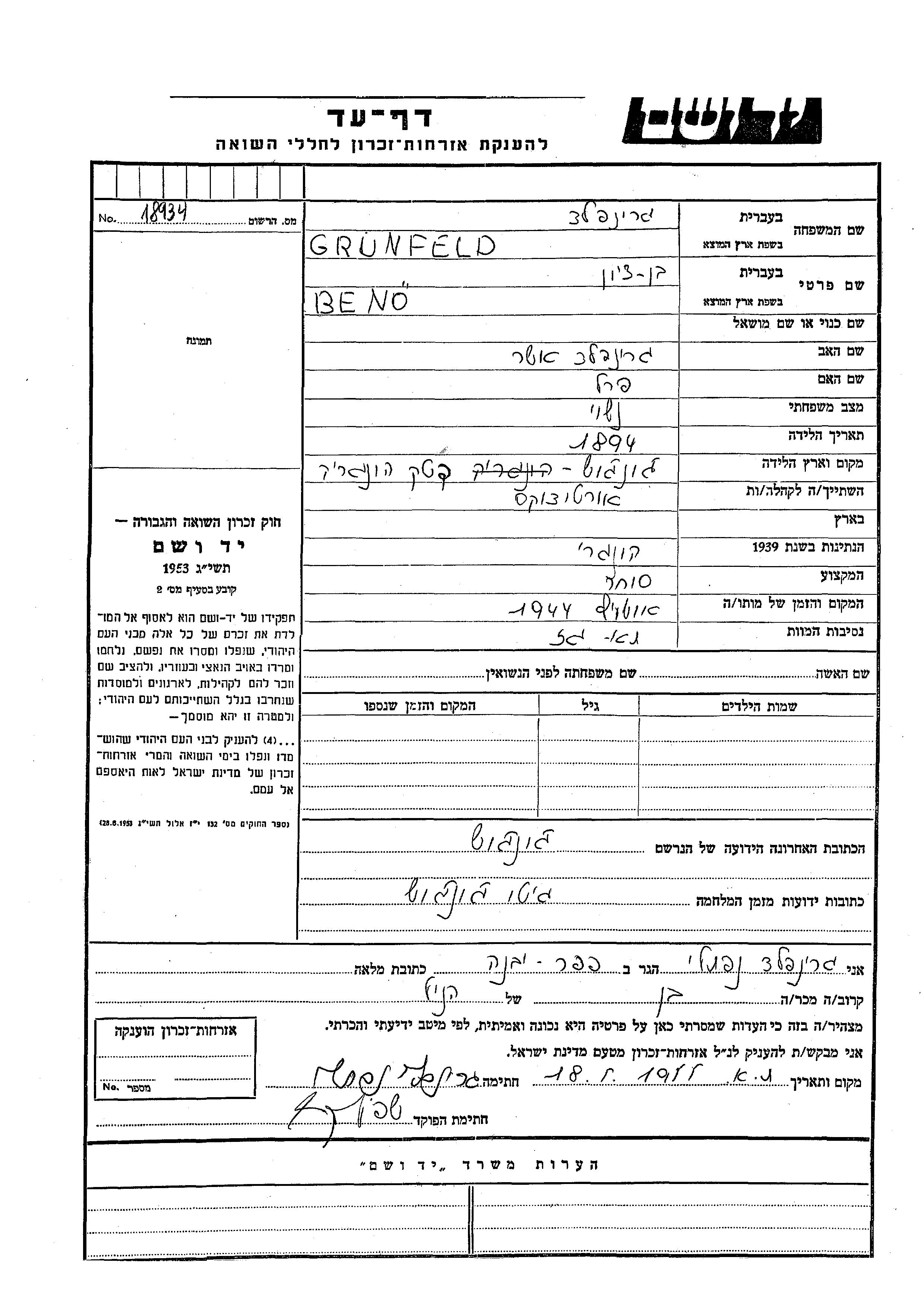 Beno Bentzion Grunfeld wurde im Jahr 1894 in Ungarn geboren. Er war der Sohn von Asher und Perel. Er war Kaufmann/-frau und Verheiratet. Während des Krieges war er in Ungarn.