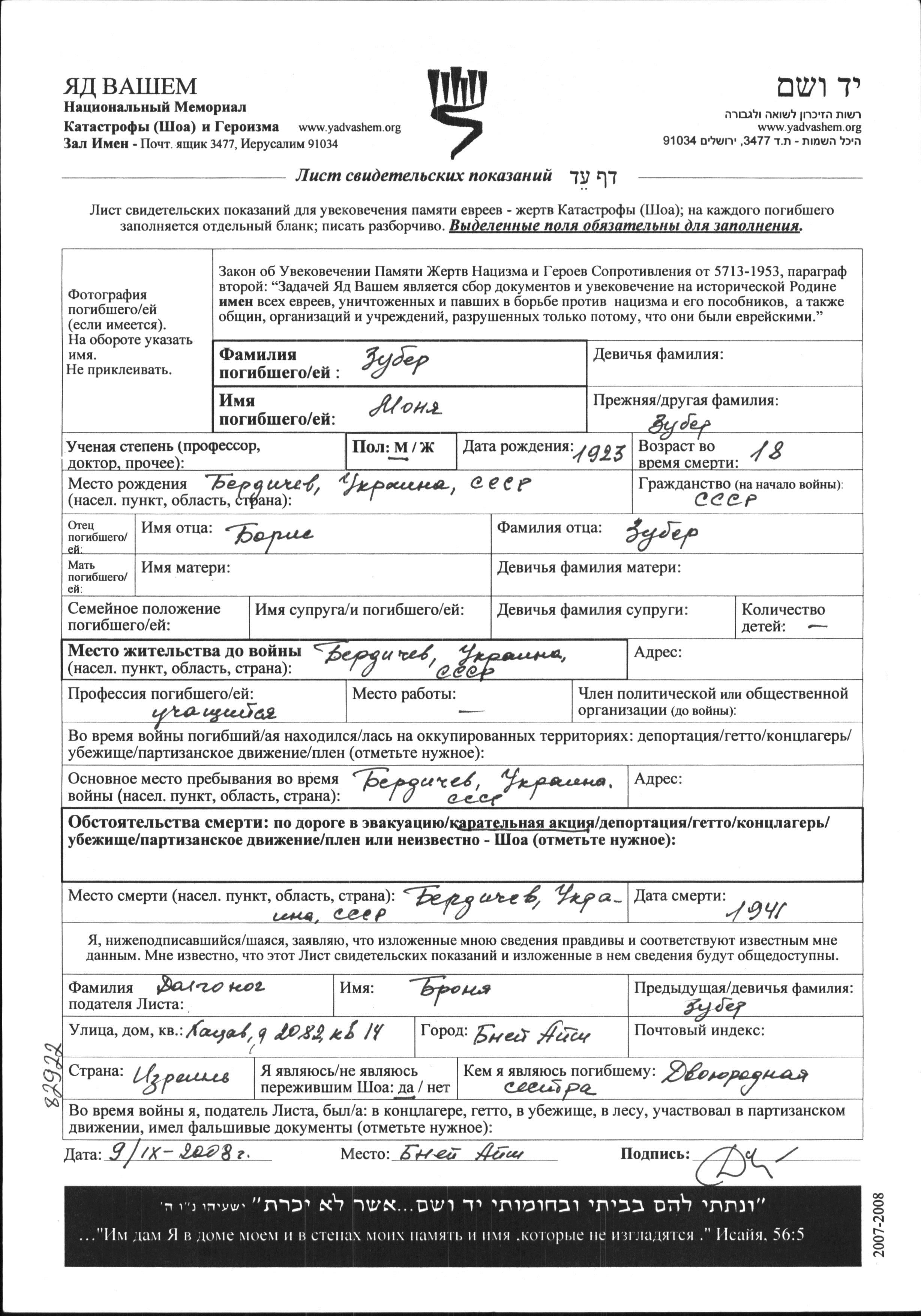Zuber Monya 1923 Berdichev, Ukraine (UdSSR) Gedenkblatt