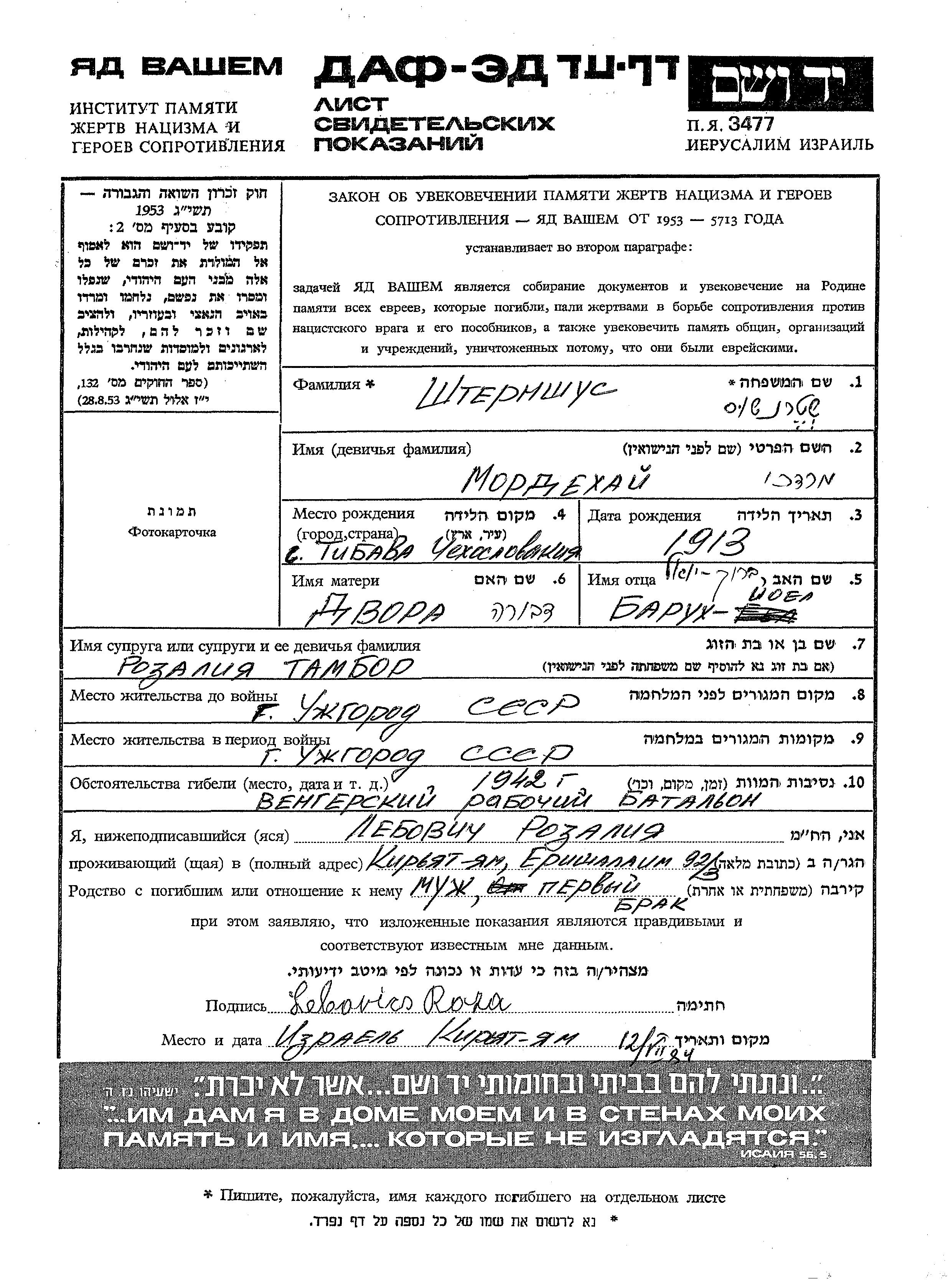 Mordekhai Shternshus wurde im Jahr 1913 in Tibava, Tschechoslowakei geboren. Er war der Sohn von Barukh Yoel und Dvora. Vor dem Zweiten Weltkrieg lebte er in Uzhgorod, Tschechoslowakei. Während des Krieges war er in Uzhgorod, Tschechoslowakei.