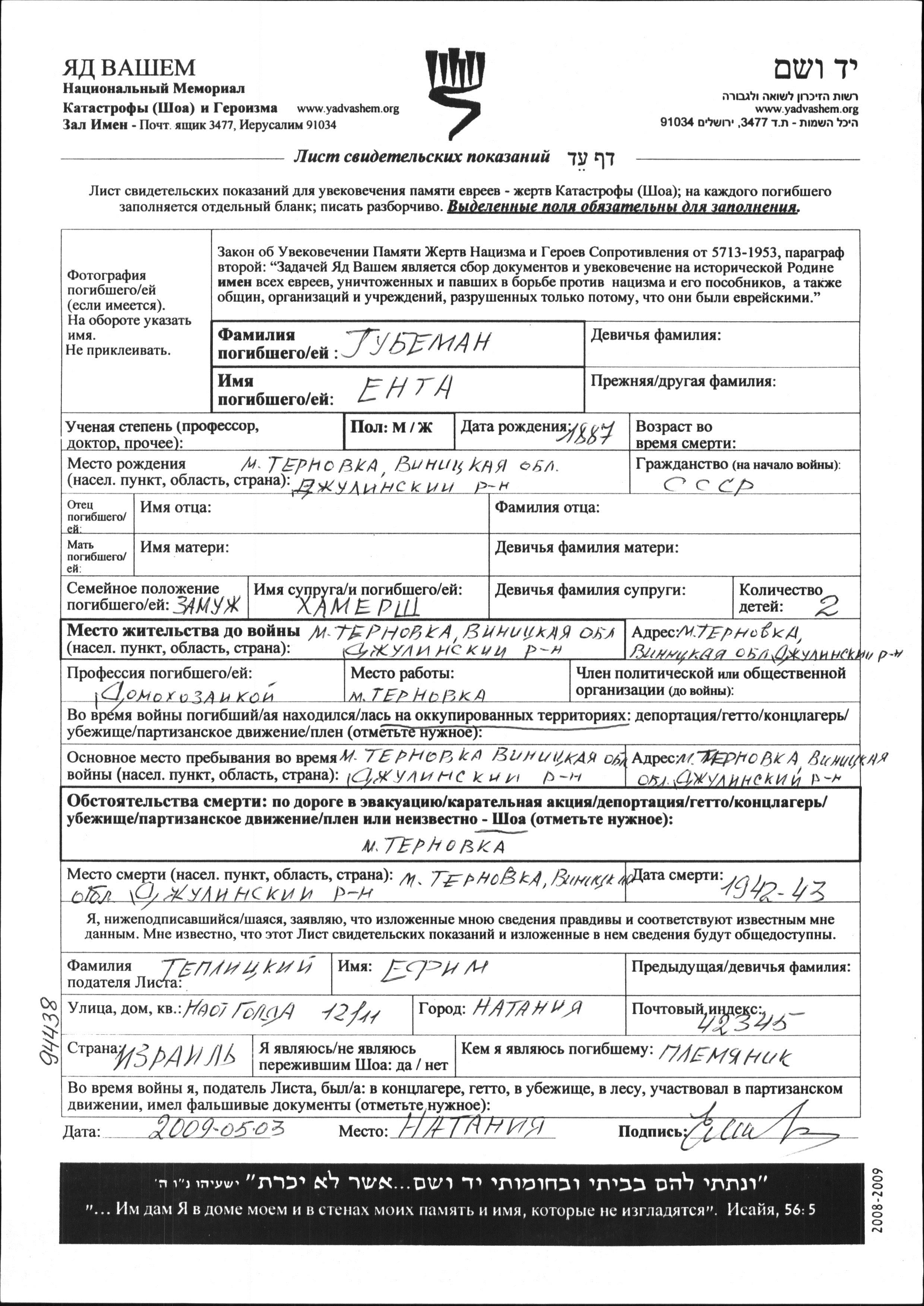 Yenta Gubeman wurde im Jahr 1887 in Ternovka, Ukraine (UdSSR) geboren. Sie war Hausfrau und mit Khamersh Verheiratet. Vor dem Zweiten Weltkrieg lebte sie in Ternovka, Ukraine (UdSSR). Während des Krieges war sie in Ternovka, Ukraine (UdSSR).