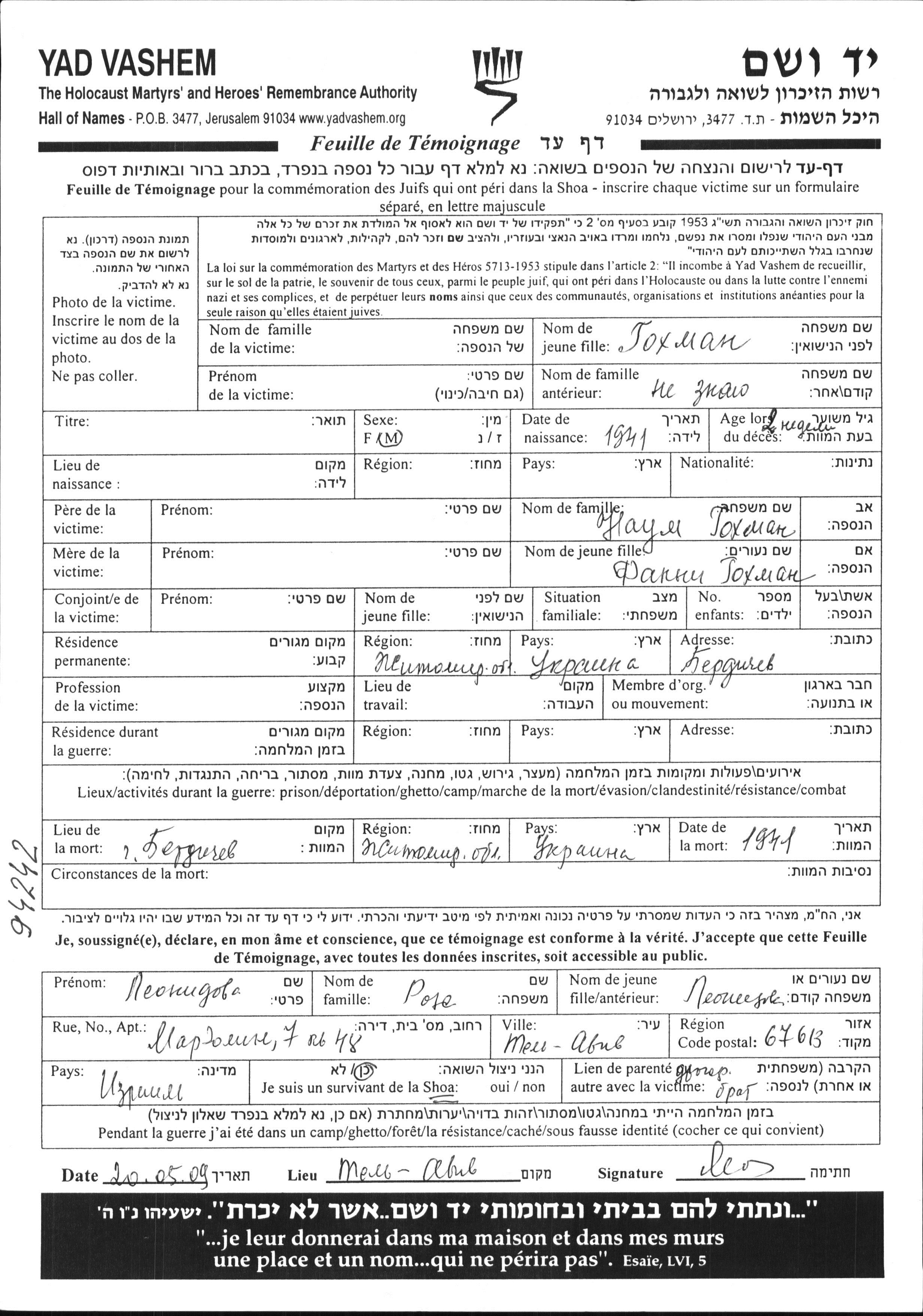 Gokhman Vorname unbekannt 1941 Berdichev, Ukraine (UdSSR) Gedenkblatt