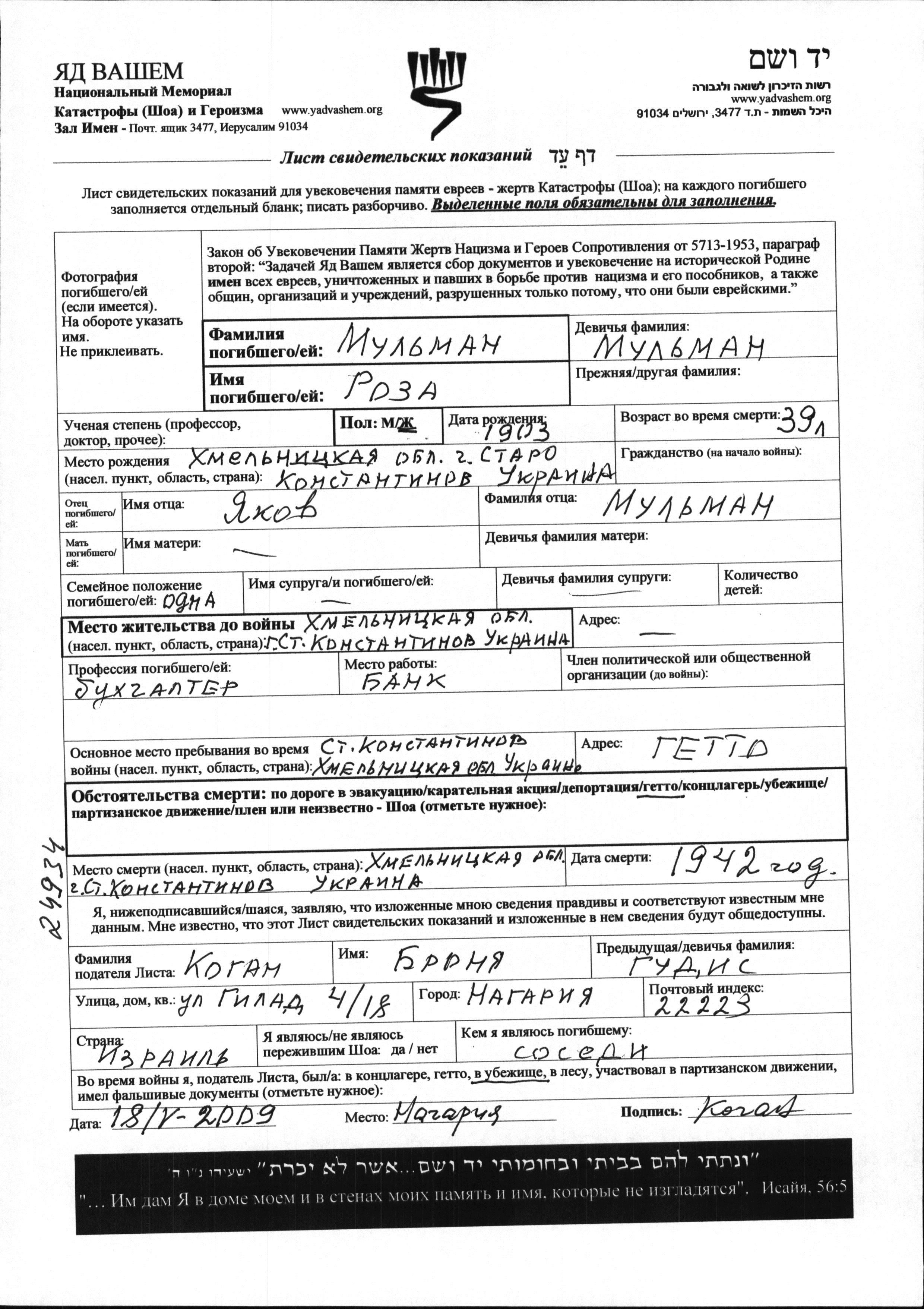 Roza Mulman wurde im Jahr 1903 in Starokonstantinov, Ukraine (UdSSR) geboren. Sie war die Tochter von Yakov. Sie war Buchhalter/-in und Ledig. Vor dem Zweiten Weltkrieg lebte sie in Starokonstantinov, Ukraine (UdSSR). Während des Krieges war sie in Starokonstantinov, Ukraine (UdSSR).