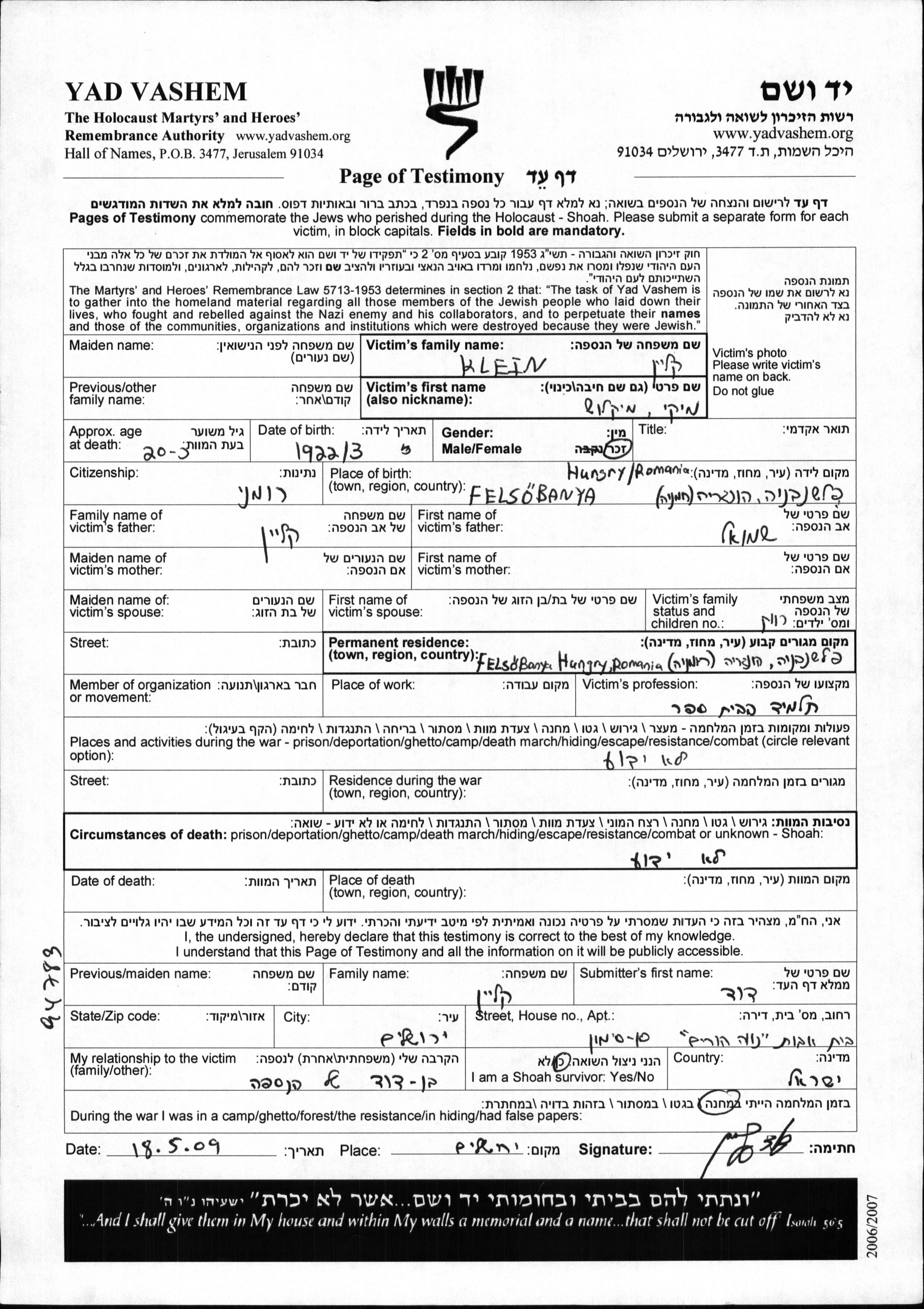 Miklosh Miki Klein wurde im Jahr 1922 in Felsobanya, Rumänien geboren. Er war der Sohn von Shmuel. Er war Schüler/-in und Ledig. Vor dem Zweiten Weltkrieg lebte er in Felsobanya, Rumänien.