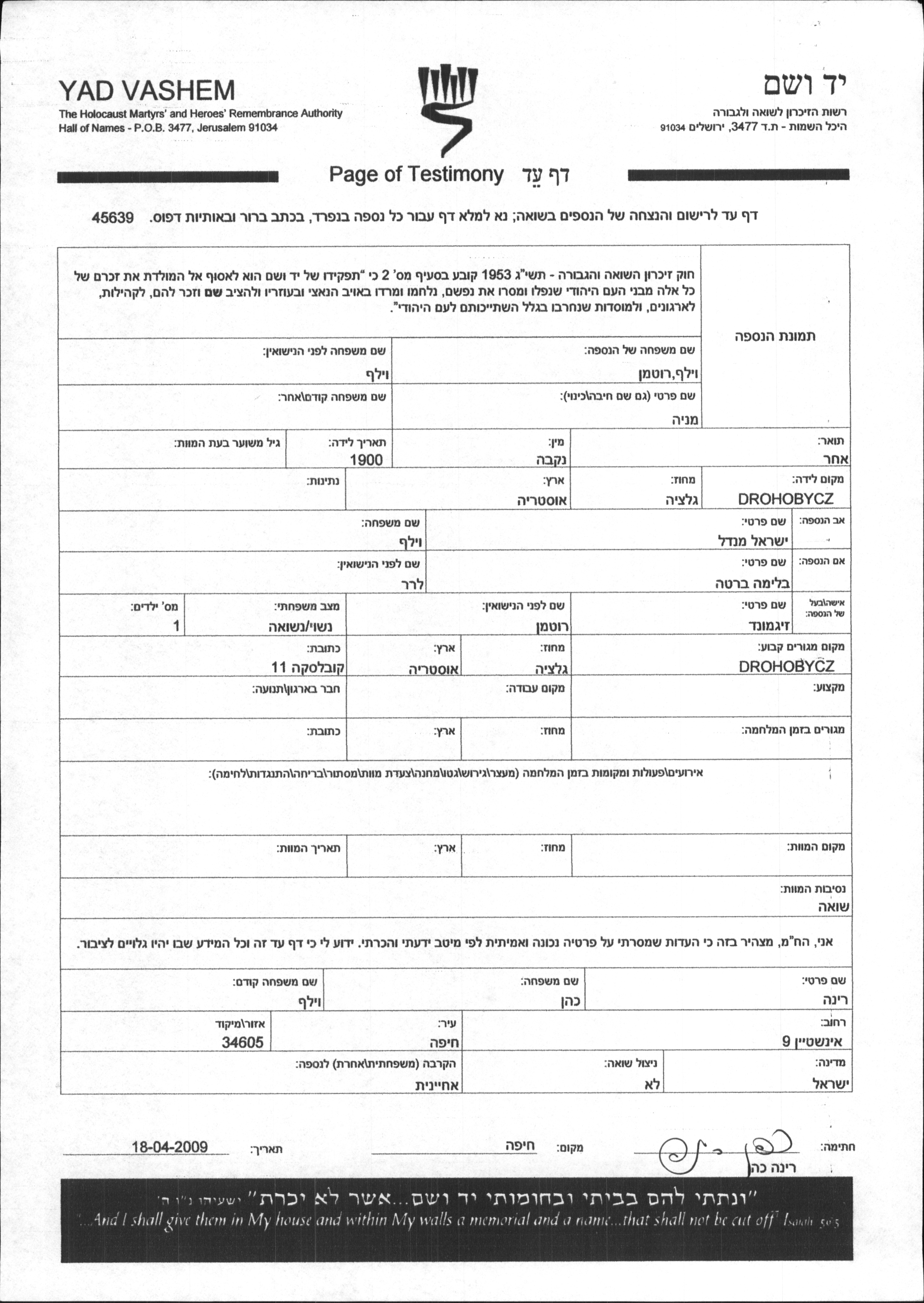 Mania Vilf Rotman, geb. Vilf wurde im Jahr 1900 in Drohobycz, Polen geboren. Sie war die Tochter von Yisrael Mendel und Blima Berta, geb. Lerer. Sie war mit Zigmund Verheiratet. Vor dem Zweiten Weltkrieg lebte sie in Drohobycz, Polen.