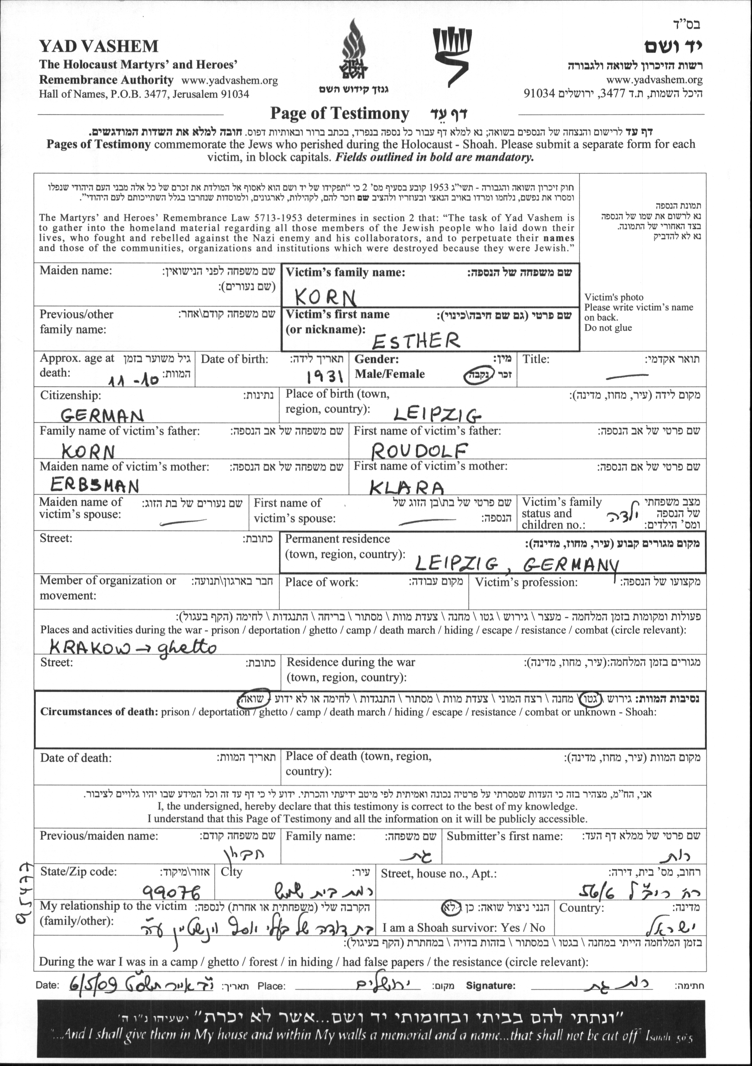 Esther Korn wurde im Jahr 1931 in Leipzig, Deutsches Reich geboren. Sie war die Tochter von Roudolf und Klara, geb. Erbsman. Sie war Kind. Vor dem Zweiten Weltkrieg lebte sie in Leipzig, Deutsches Reich. Während des Krieges war sie in Krakow, Polen.