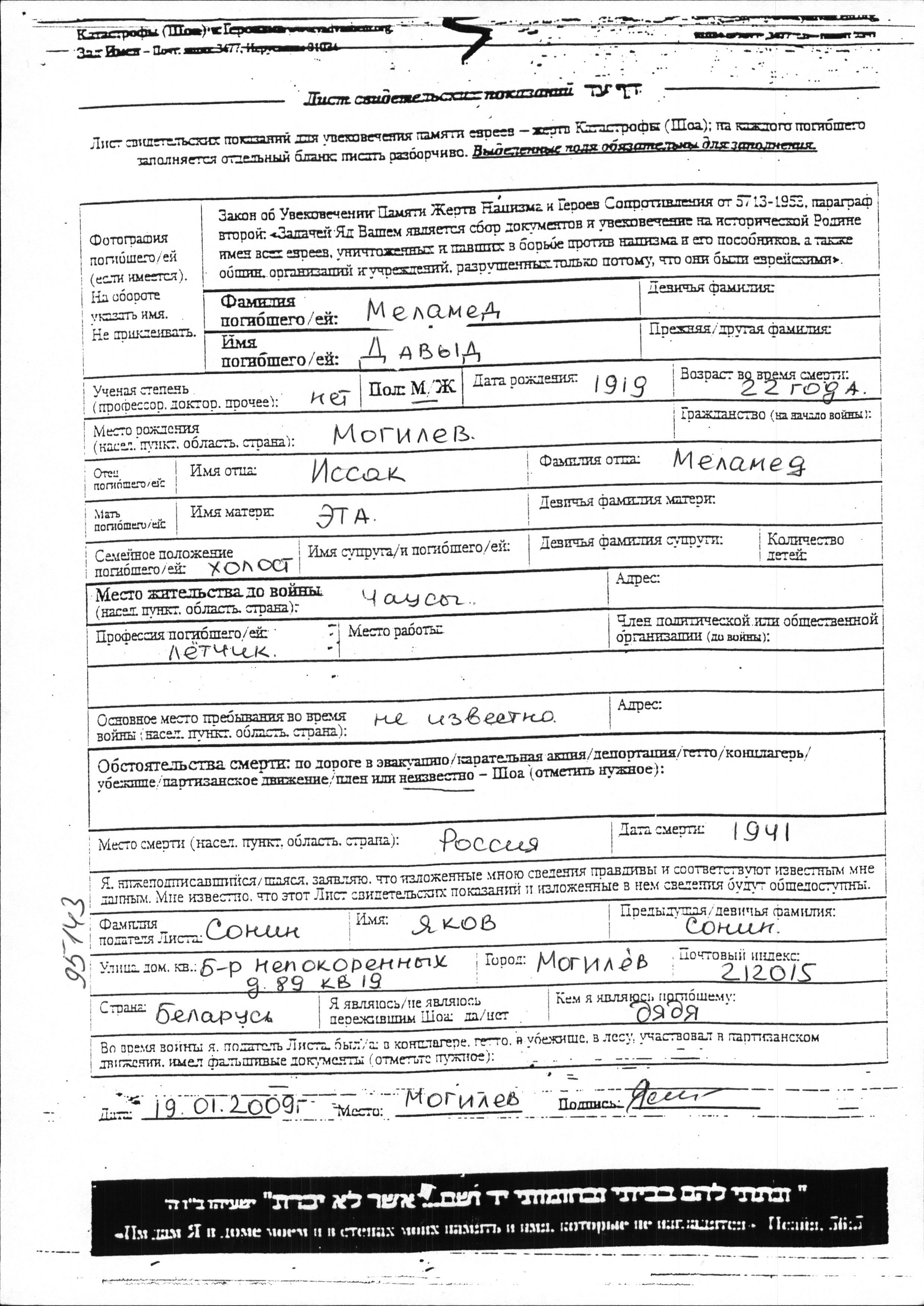 Davyd Melamed wurde im Jahr 1919 in Mogilev, Weißrussland (UdSSR) geboren. Er war der Sohn von Issak und Eta. Er war Pilot und Ledig. Vor dem Zweiten Weltkrieg lebte er in Chaussy, Weißrussland (UdSSR). Während des Krieges war er in die Sowjetischen Streitkräfte.