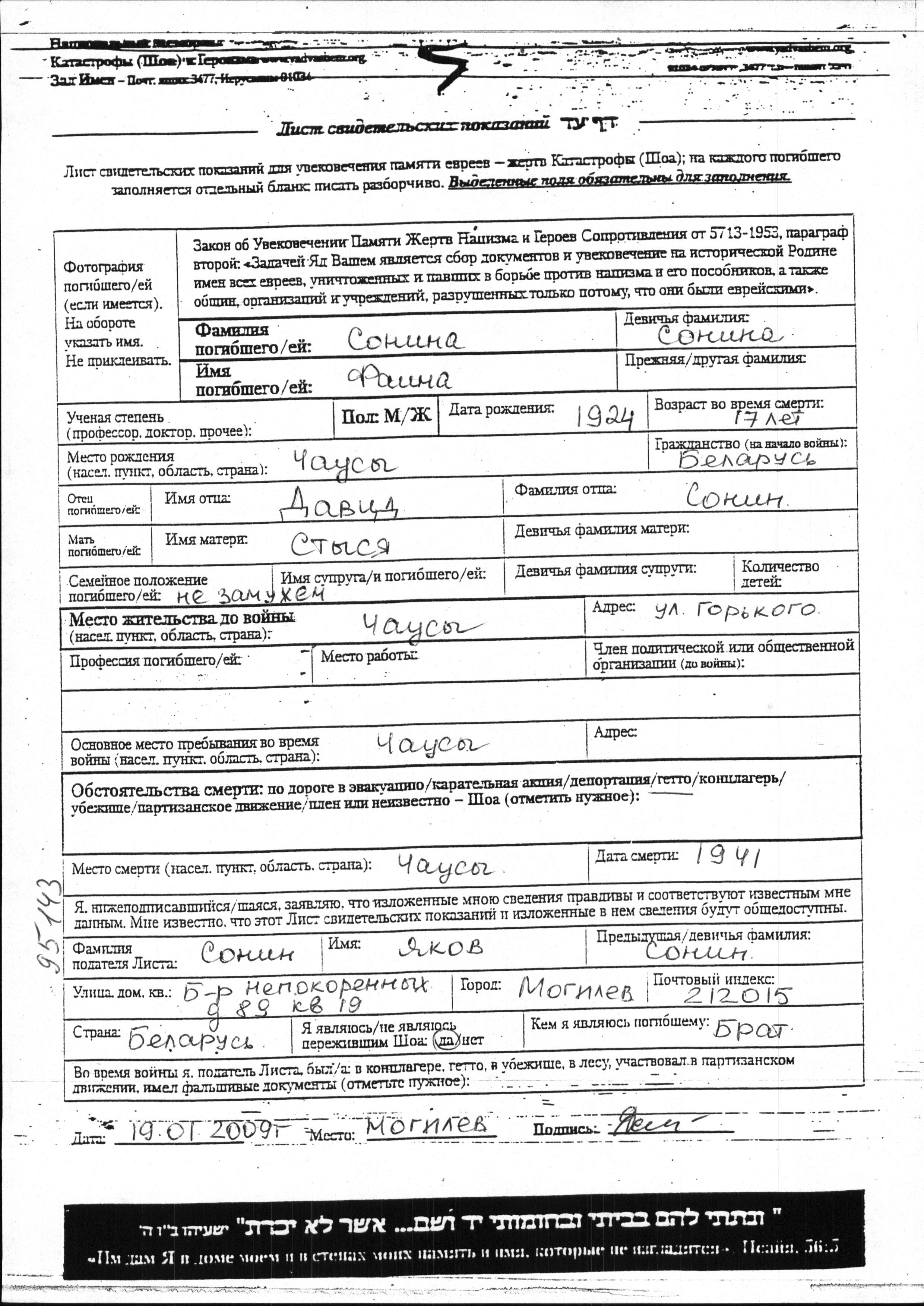 Faina Sonina wurde im Jahr 1924 in Chausy, Weißrussland (UdSSR) geboren. Sie war die Tochter von David und Stysya. Sie war Jugendliche/-r. Vor dem Zweiten Weltkrieg lebte sie in Chausy, Weißrussland (UdSSR). Während des Krieges war sie in Chausy, Weißrussland (UdSSR).