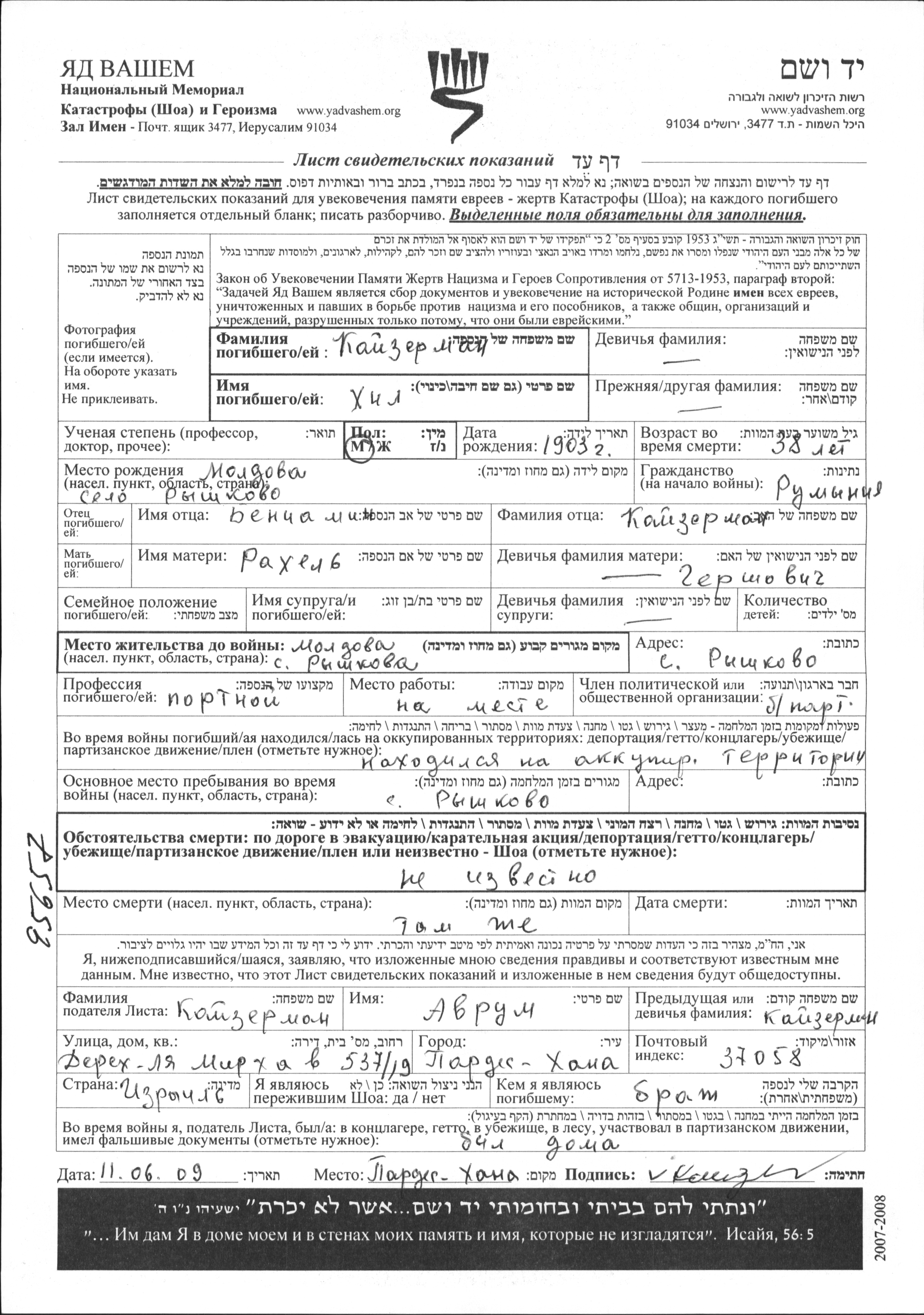Khil Kaizerman wurde im Jahr 1903 in Rîșcova, Rumänien geboren. Er war der Sohn von Beniamin und Rakhel, geb. Gershovich. Er war Schneider. Vor dem Zweiten Weltkrieg lebte er in Rîșcova, Rumänien. Während des Krieges war er in Rîșcova, Rumänien.