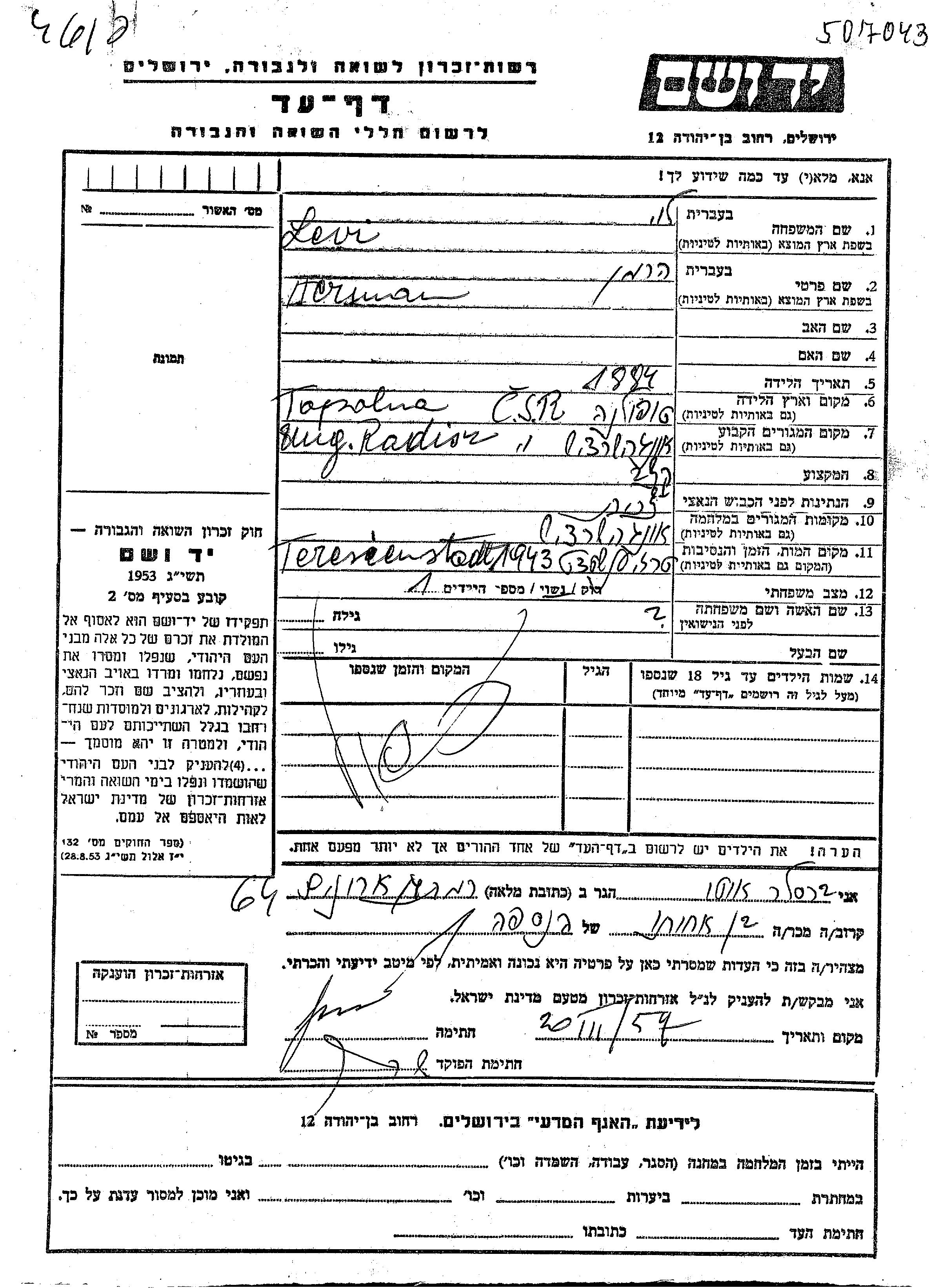 Herman Levi wurde im Jahr 1884 in Topolná, Tschechoslowakei geboren. Er war Metzger/-in und Verheiratet. Vor dem Zweiten Weltkrieg lebte er in Ungarisch Hradisch, Tschechoslowakei. Während des Krieges war er in Ungarisch Hradisch, Tschechoslowakei.