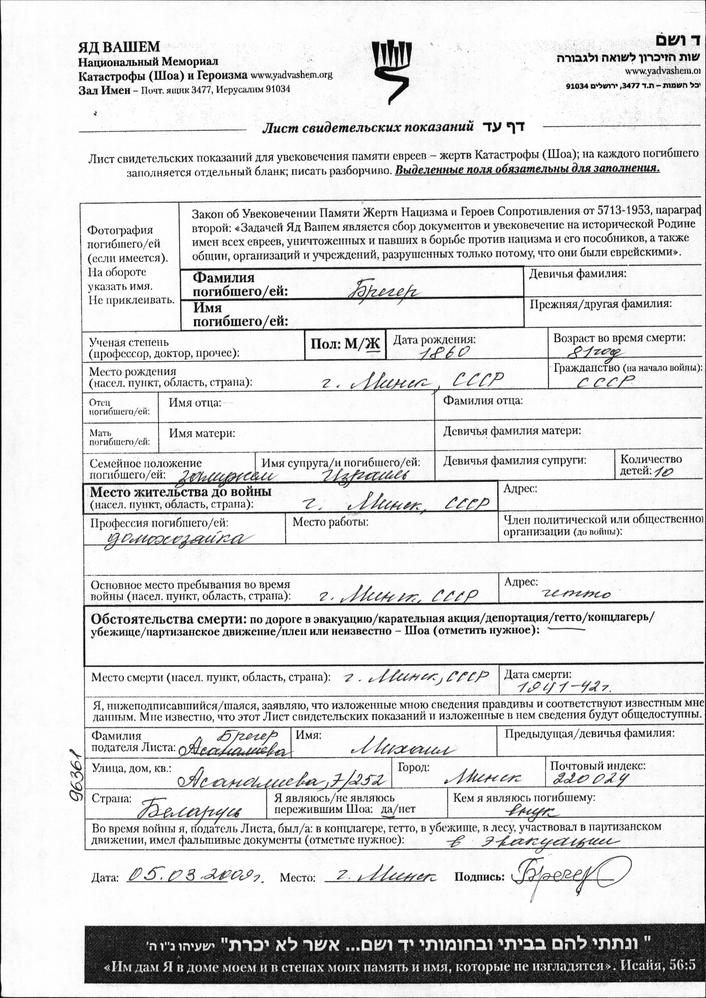Vorname unbekannt Breger wurde im Jahr 1860 in Minsk, Weißrussland (UdSSR) geboren. Sie war Hausfrau und mit Izrail Verheiratet. Vor dem Zweiten Weltkrieg lebte sie in Minsk, Weißrussland (UdSSR). Während des Krieges war sie in Minsk, Weißrussland (UdSSR).