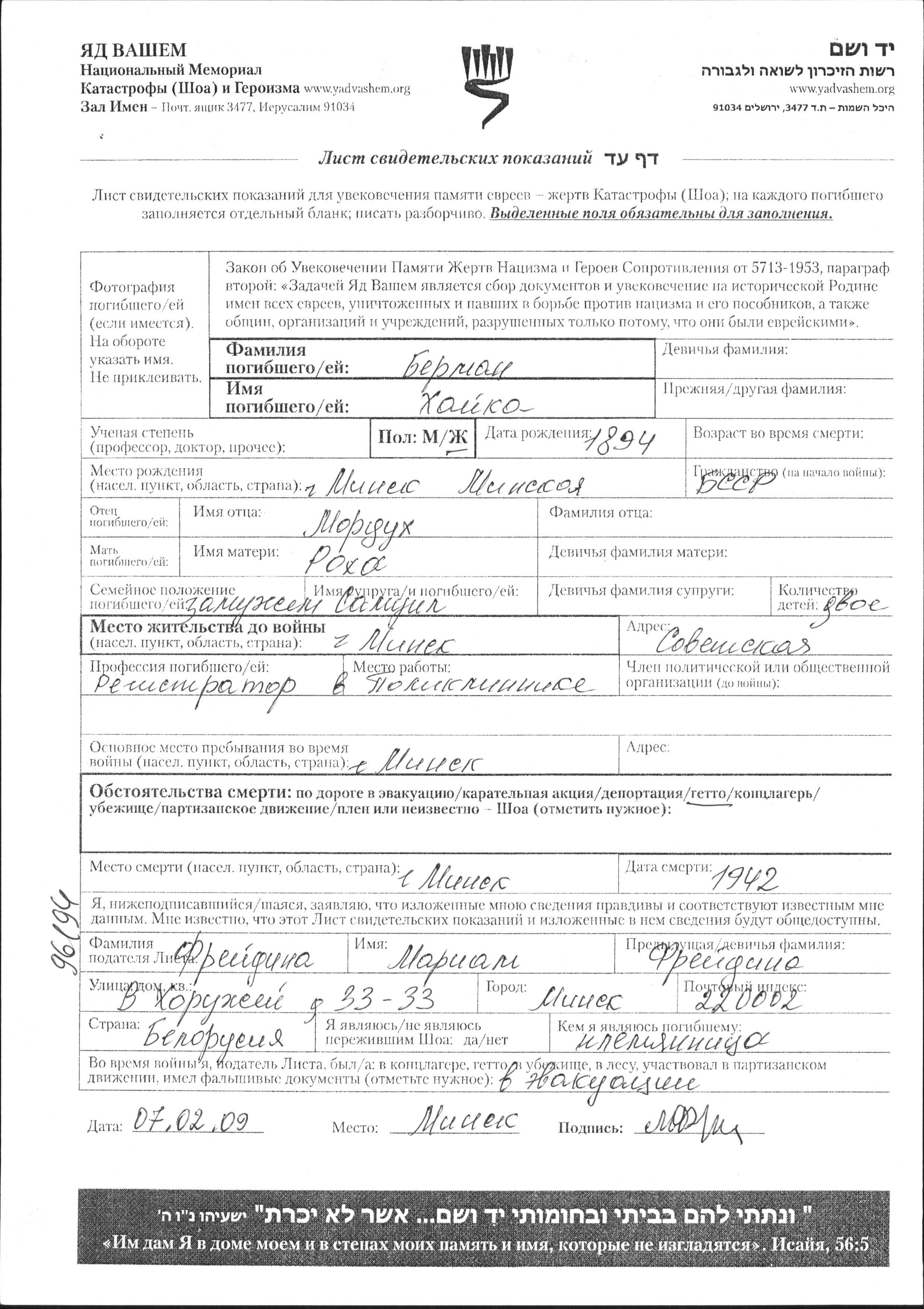 Khaika Berman wurde im Jahr 1894 in Minsk, Weißrussland (UdSSR) geboren. Sie war die Tochter von Mordukh und Rokha. Sie war Registrator v poliklinike und mit Samuil Verheiratet. Vor dem Zweiten Weltkrieg lebte sie in Minsk, Weißrussland (UdSSR). Während des Krieges war sie in Minsk, Weißrussland (UdSSR).