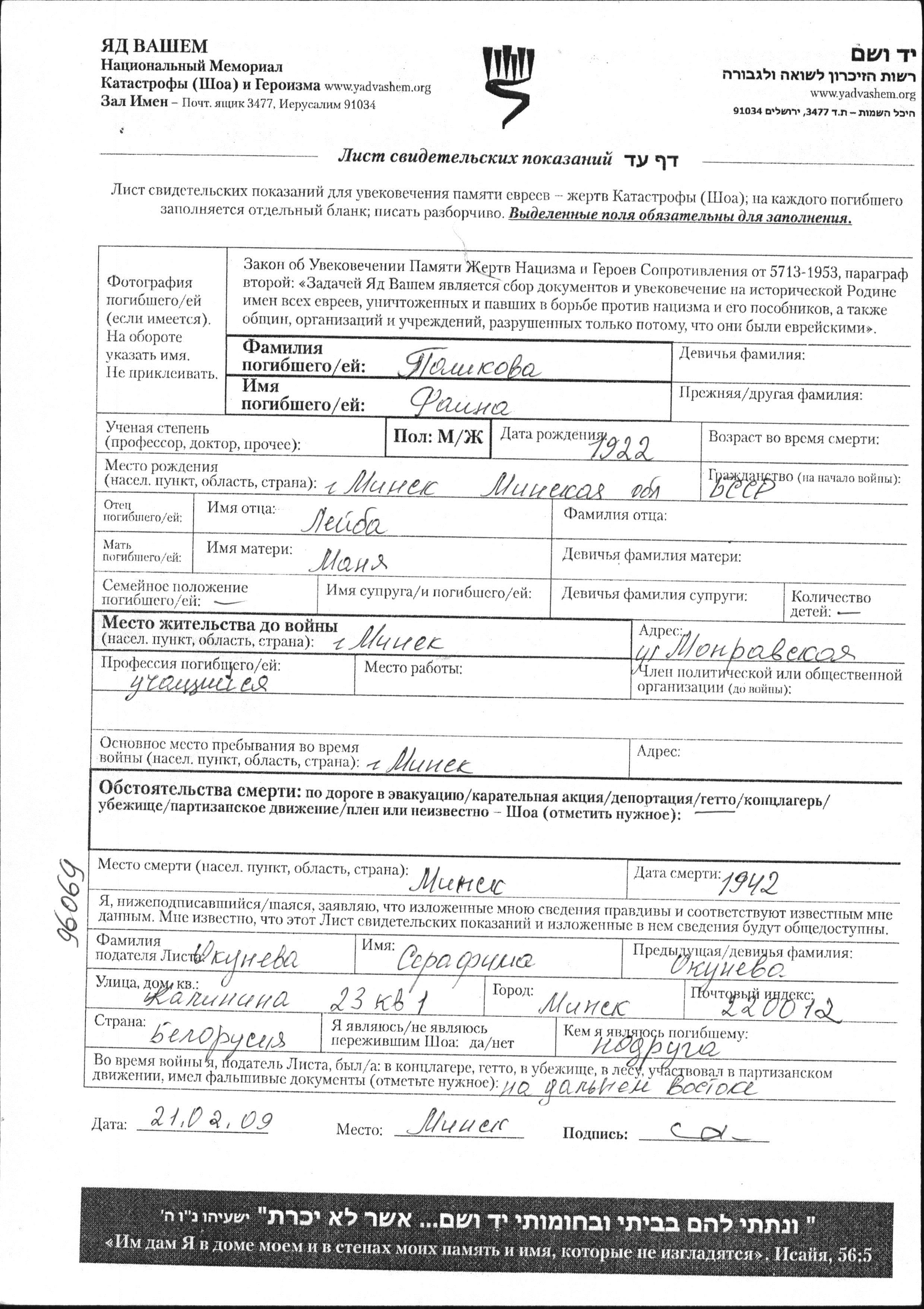 Faina Pashkova wurde im Jahr 1922 in Minsk, Weißrussland (UdSSR) geboren. Sie war die Tochter von Leiba und Manya. Sie war Uchashchiysya und Ledig. Vor dem Zweiten Weltkrieg lebte sie in Minsk, Weißrussland (UdSSR). Während des Krieges war sie in Minsk, Weißrussland (UdSSR).