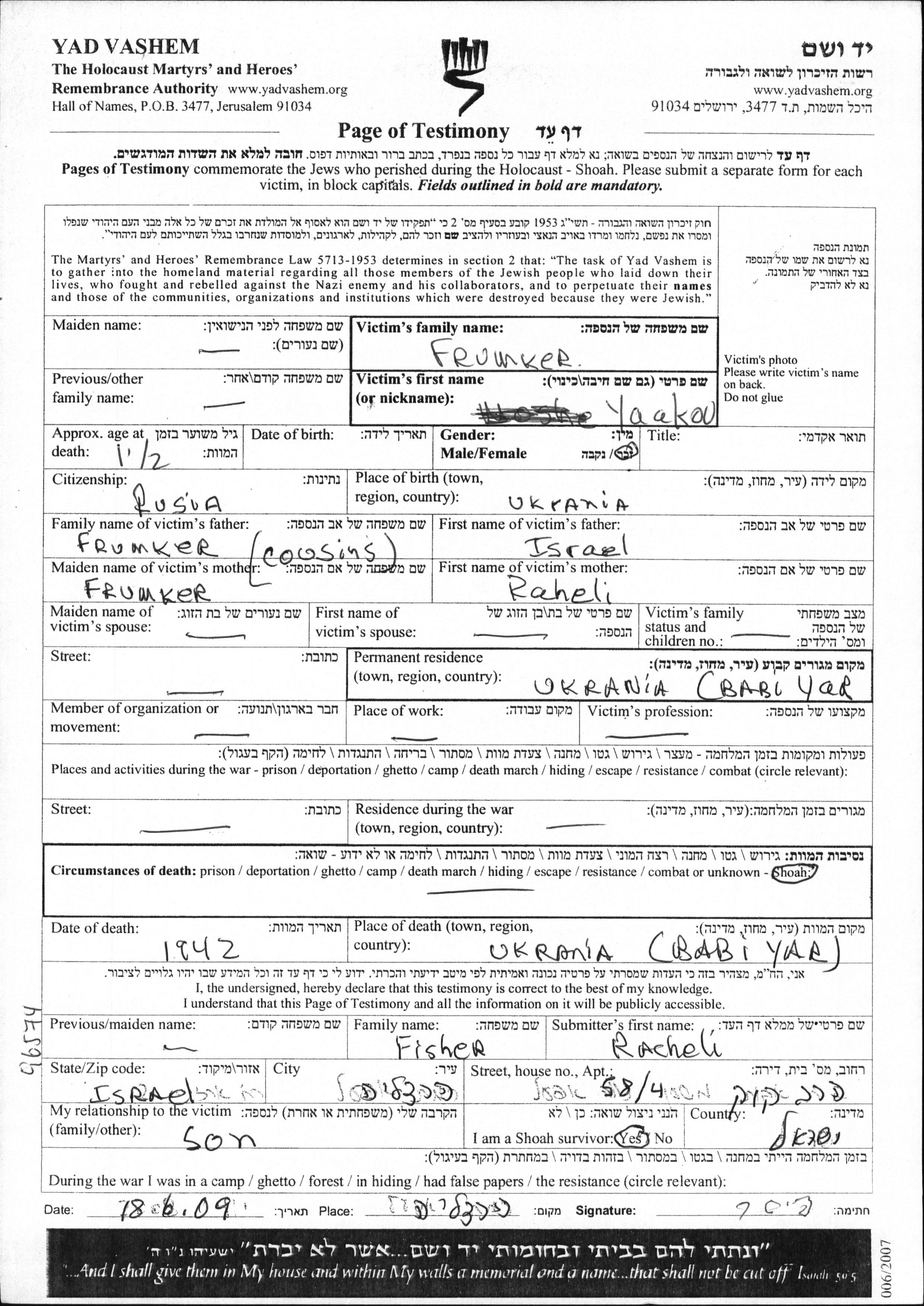 Yaakov wurde in der Schoah ermordet. Todesort: Babi Yar, Ukraine (UdSSR) im Jahr 1942.