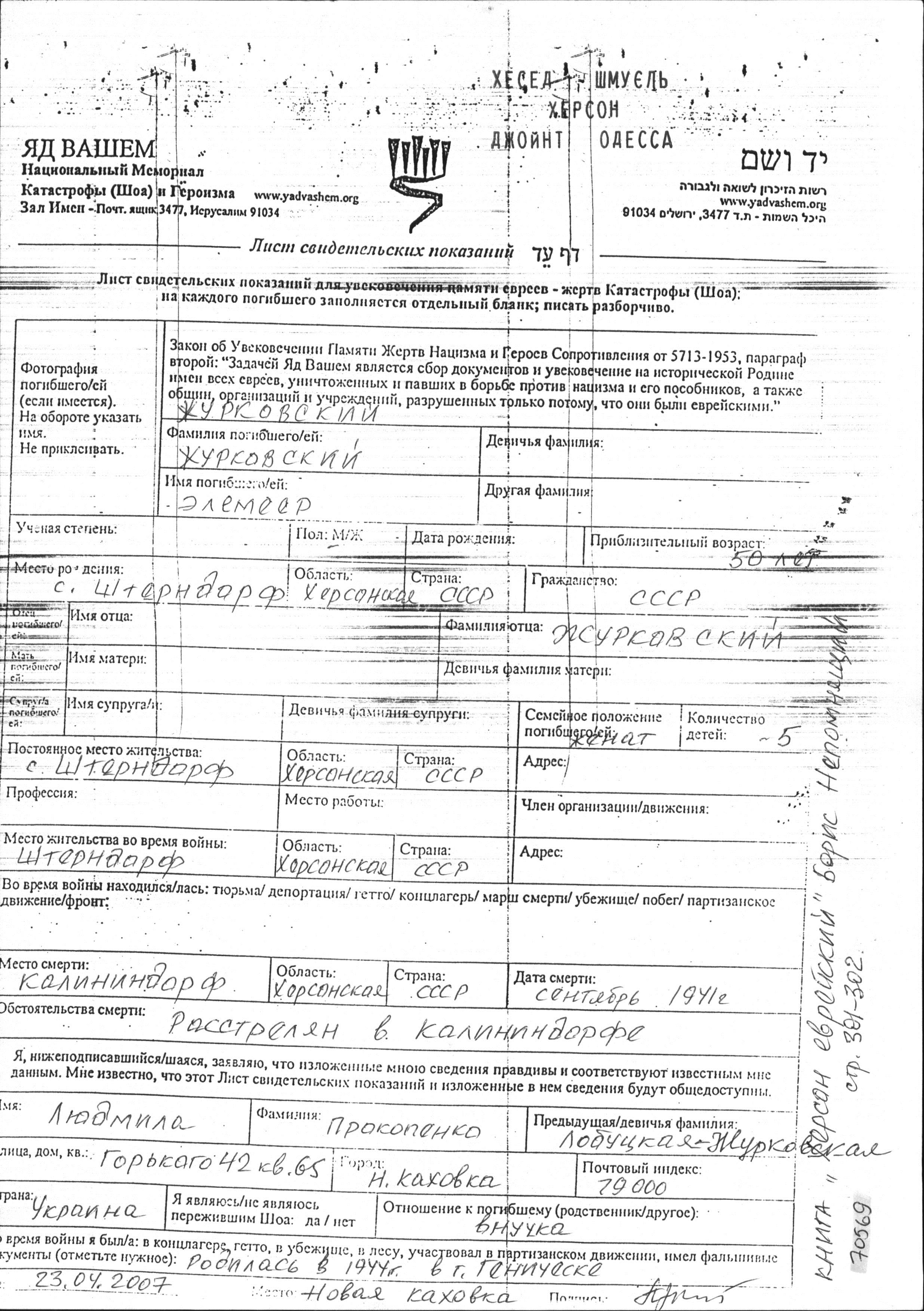 Ele Meyer Zhurkovski wurde in Shterndorf, Ukraine (UdSSR) geboren. Er war Verheiratet. Vor dem Zweiten Weltkrieg lebte er in Shterndorf, Ukraine (UdSSR). Während des Krieges war er in Shterndorf, Ukraine (UdSSR).