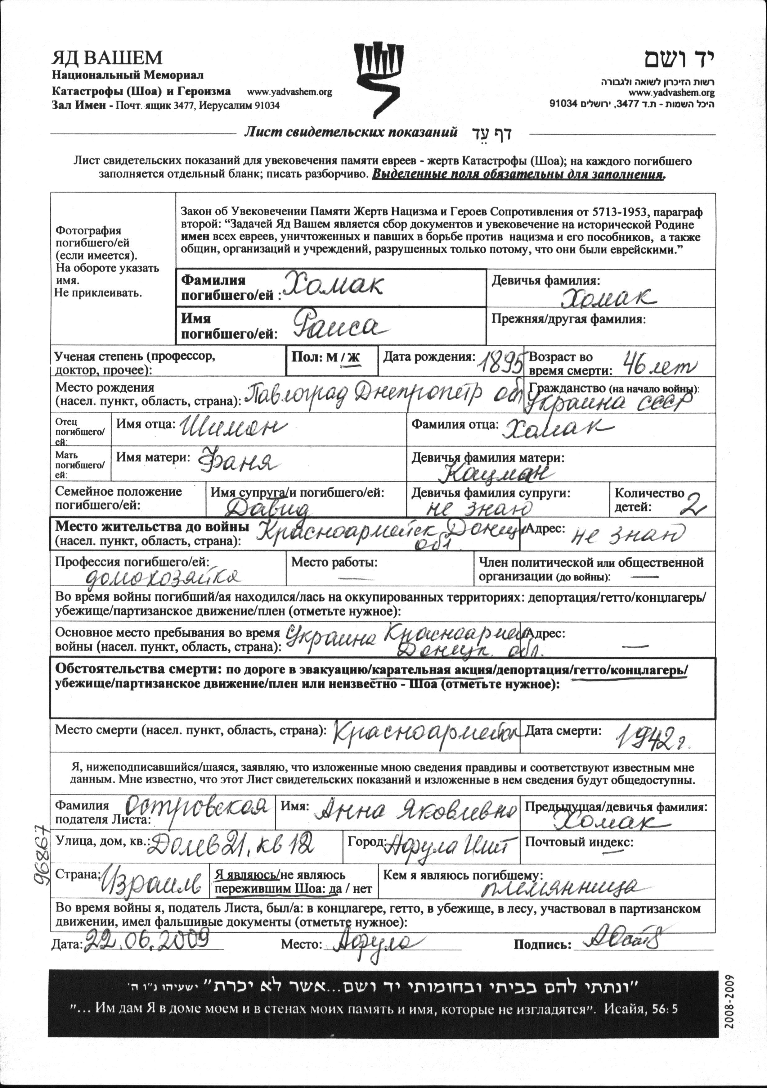 Raisa Khomak wurde im Jahr 1895 in Pavlograd, Ukraine (UdSSR) geboren. Sie war die Tochter von Shimon und Fanya, geb. Katzman. Sie war Hausfrau und mit David Verheiratet. Vor dem Zweiten Weltkrieg lebte sie in Krasnoarmeysk, Ukraine (UdSSR). Während des Krieges war sie in Krasnoarmeysk, Ukraine (UdSSR).