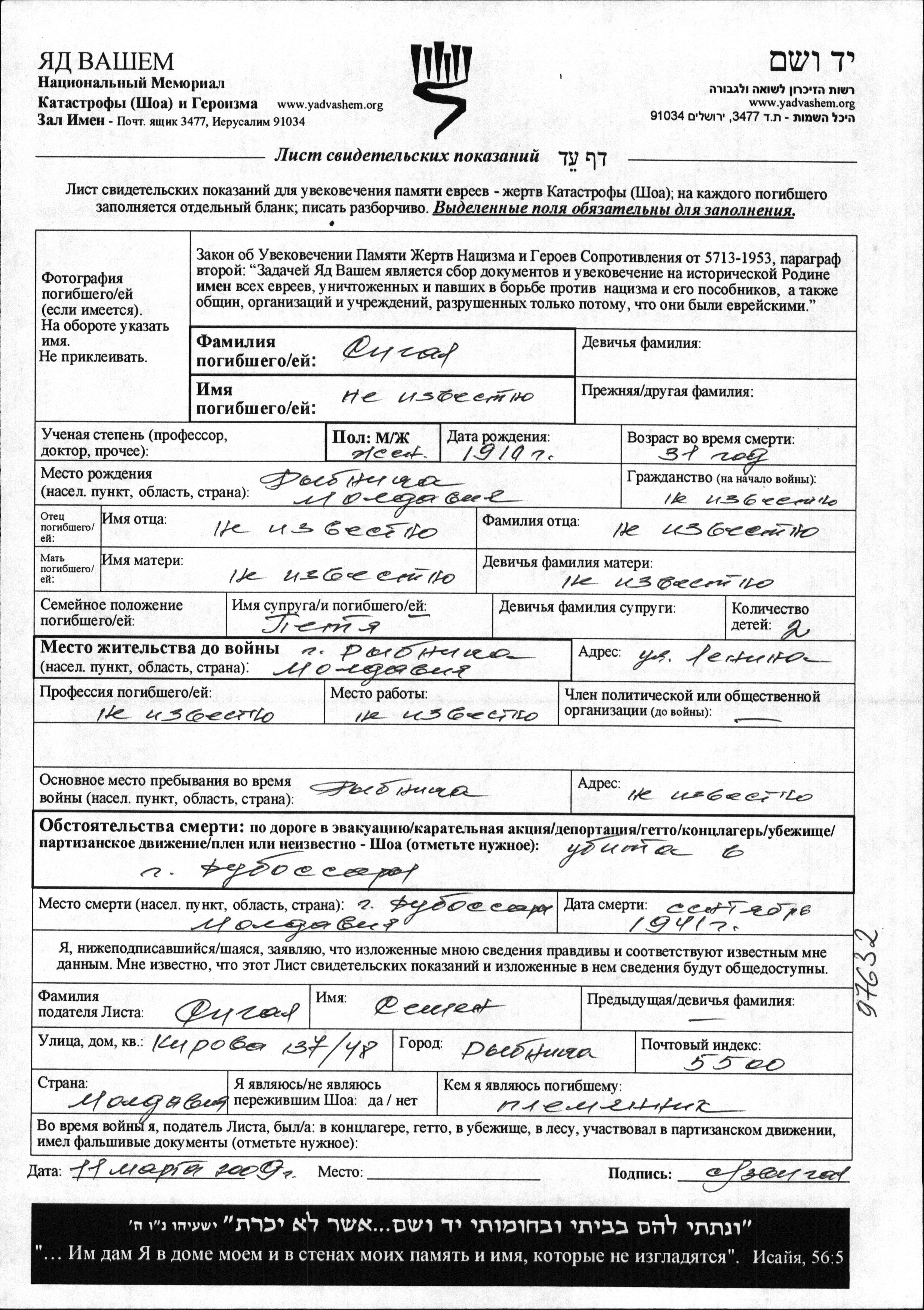 Sie wurde in der Schoah ermordet. Todesort: Dubosar, Ukraine (UdSSR) im Jahr 09/1941.
