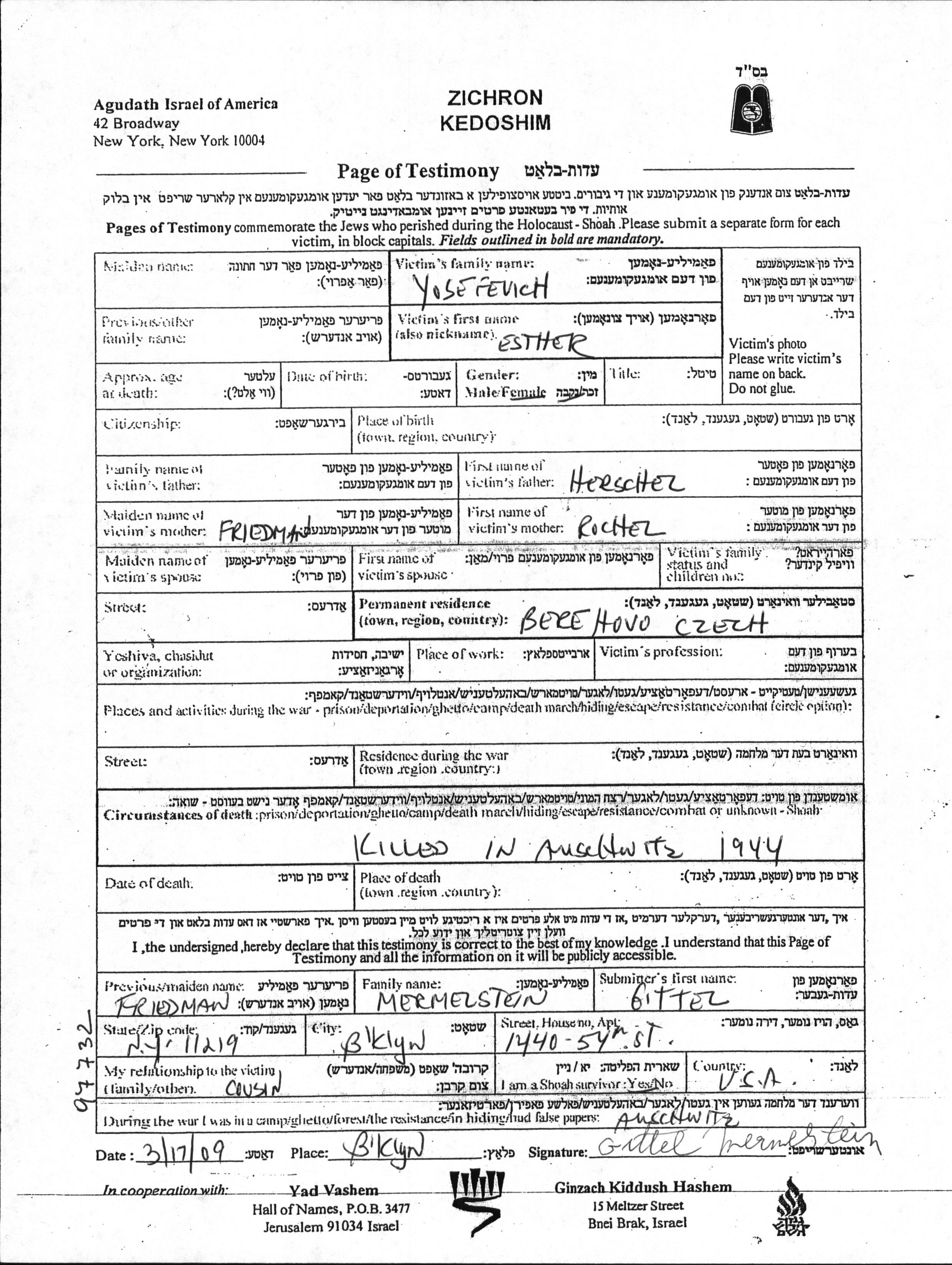Yosefevich Esther Berehovo, Tschechoslowakei Gedenkblatt