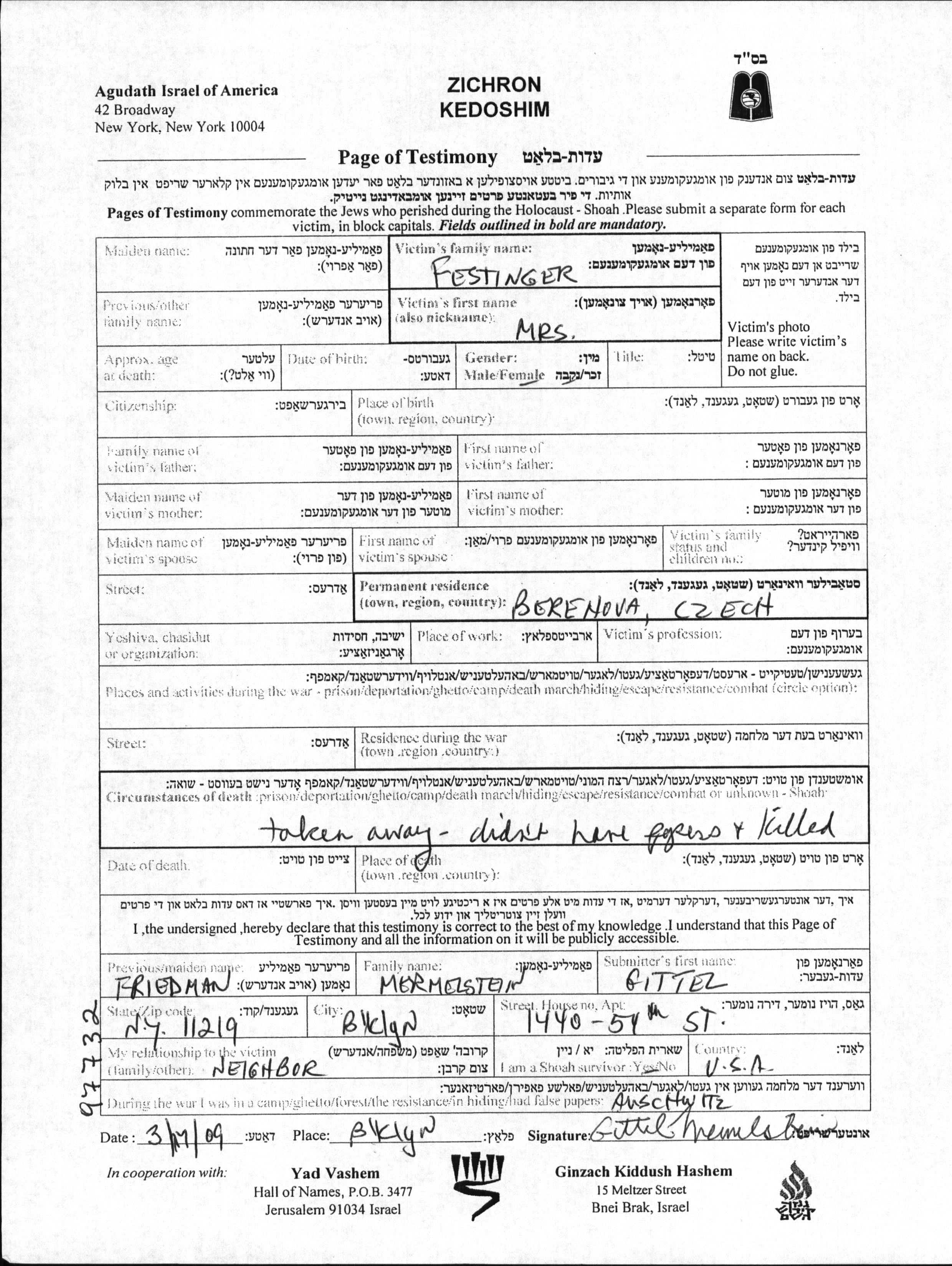 Vorname unbekannt Festinger. Vor dem Zweiten Weltkrieg lebte sie in Berehovo, Tschechoslowakei. Während des Krieges war sie in Berehovo, Tschechoslowakei.