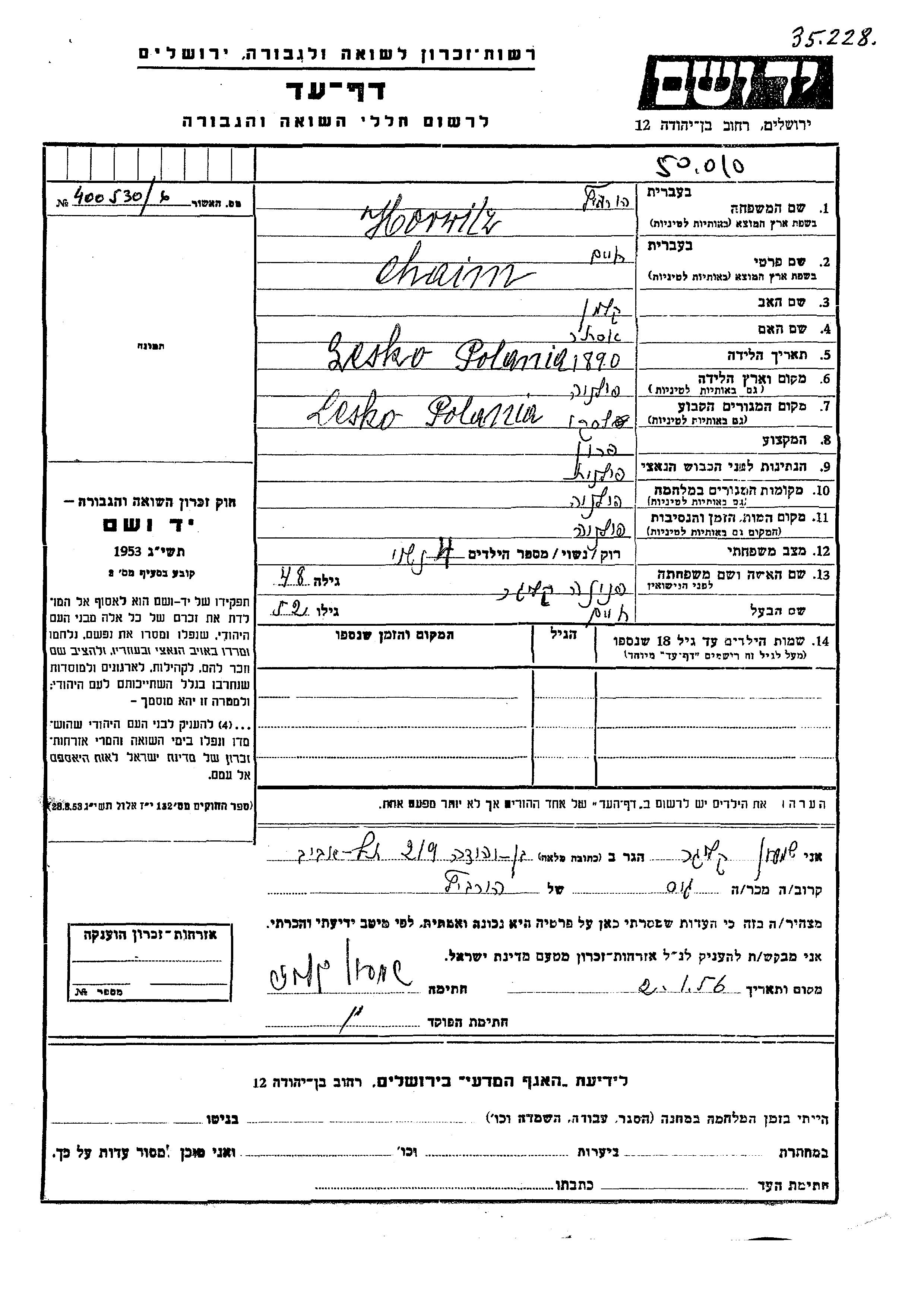 Chaim Horwitz Hurvitz wurde im Jahr 1890 in Lesko, Polen geboren. Er war der Sohn von Kalman und Ester. Er war Kürschner/-in und mit Pnina, geb. Kliger Verheiratet. Vor dem Zweiten Weltkrieg lebte er in Lesko, Polen. Während des Krieges war er in Polen.