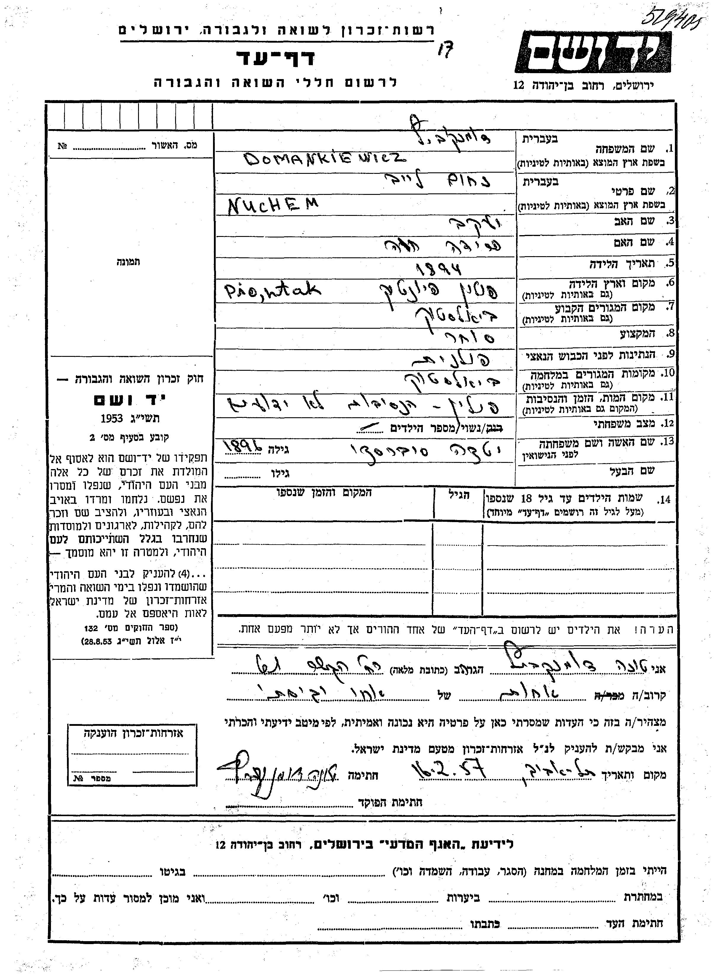 Nuchem Leib Domankiewicz wurde im Jahr 1894 in Piontek, Polen geboren. Er war der Sohn von Yaakov und Frida Khana. Er war Kaufmann/-frau und mit Itka, geb. Soberski Verheiratet. Vor dem Zweiten Weltkrieg lebte er in Bialystok, Polen. Während des Krieges war er in Bialystok, Polen.