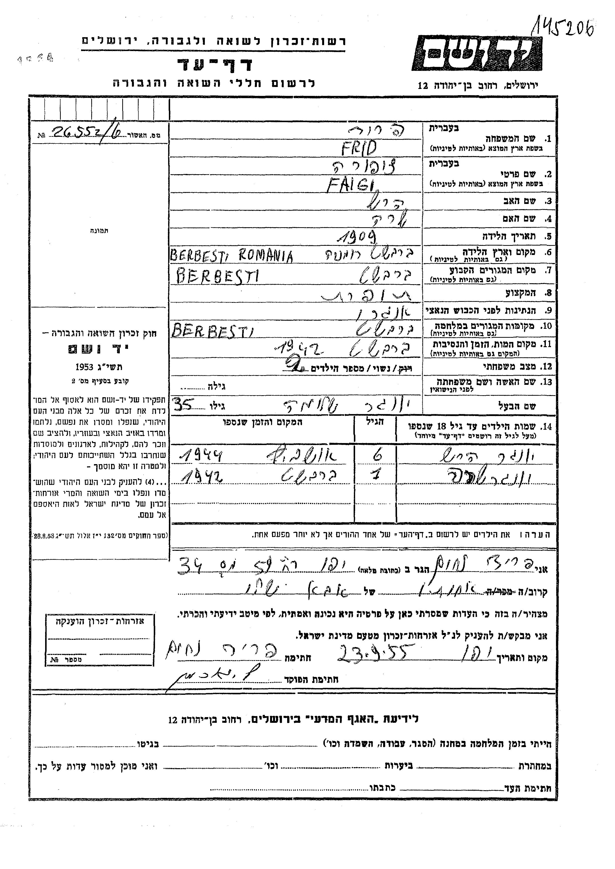 Faigi Tzipora Iunger, geb. Frid wurde im Jahr 1909 in Berbesti, Rumänien geboren. Sie war die Tochter von Hersh und Sara. Sie war Schneiderin und mit Shlomo Verheiratet. Vor dem Zweiten Weltkrieg lebte sie in Berbesti, Rumänien. Während des Krieges war sie in Berbesti, Rumänien.